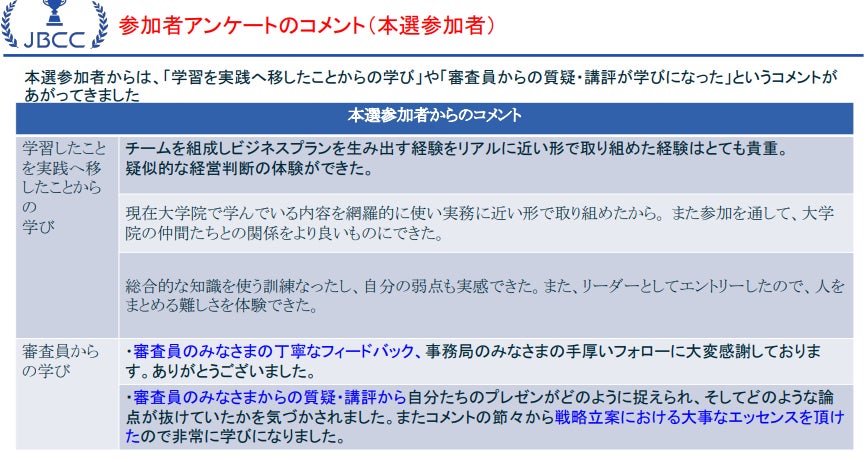 経営学を学ぶ現役生のうち実際の業務で経営戦略そのものを取り扱うポジションにいる方はまだまだ少ないのが現状ですが、JBCCで取り扱うケースは極めて現実に近い設計となっているため「実践に近いアウトプット」の機会として全国の大学院から評価をいただいております。