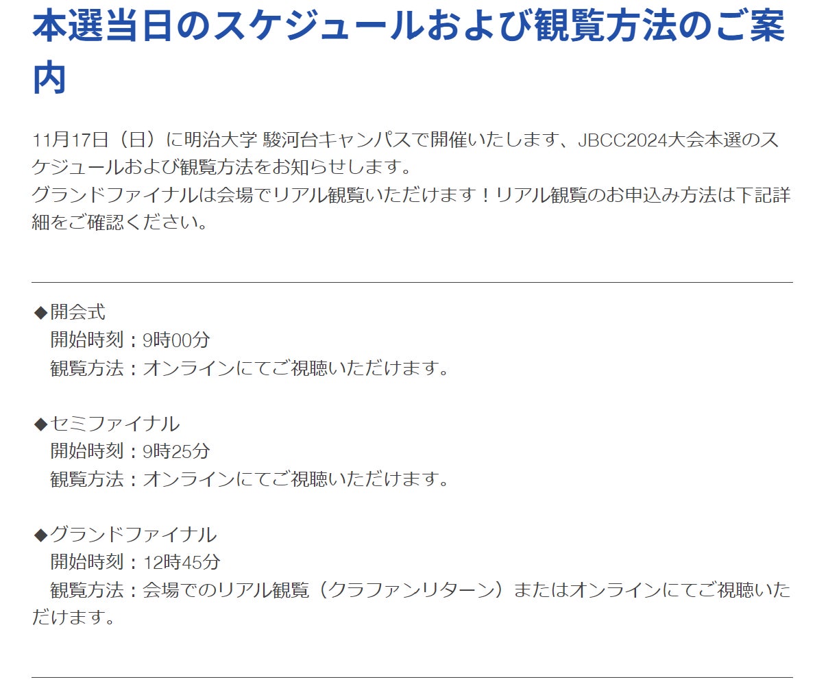 今年は、リアルタイムでのオンライン配信とともに、明治大学駿河台キャンパス リバティホールをお借りし、観客を招いて本選グランドファイナルを観戦して頂きます!まだお席には余裕があります。より多くの方にリアル会場にお越しいただき、ぜひともご一緒にグランドファイナルを盛り上げていただけましたらと思います。