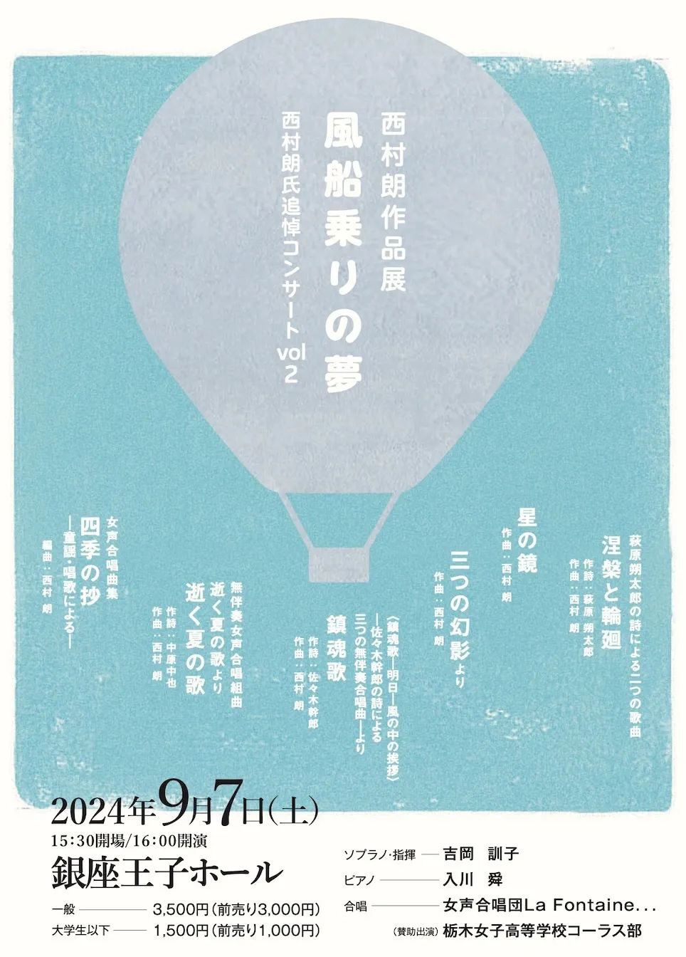 西村先生の頭の中では、「風船乗りの夢」がどんな音楽となって奏でられていたのでしょうか。まだ見ぬ「風船乗りの夢」を皆さまにお聴きいただくことは叶いませんが、少なくとも、それにつながる、渾身の西村朗先生の合唱作品たちを精一杯演奏させていただきたいと思っています。