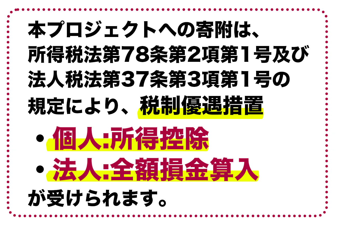 本プロジェクトの寄附金は、税制優遇措置(個人:所得控除、法人:全額損金算入)の対象となります。