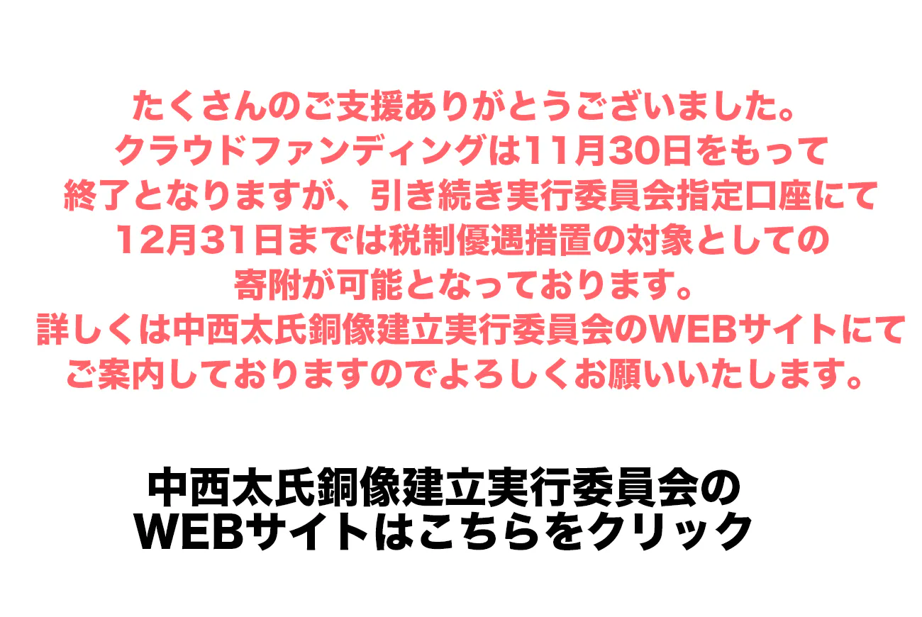 「太っさん」と呼ばれ誰からも敬愛される中西太氏。彼は自分のためではなく、人のために生きた。家族のため、チームのため、仲間のため、野球界のため、90年の人生を捧げた。高松市中央公園には大先輩である水原茂氏と三原脩氏の像が立ち、彼の像が建立されることを待っているようだ。怪童と呼ばれ、球界きっての強打者でありながら名伯楽、中西太氏の心と雄姿を後世に伝えたい。皆様方のご寄附、ご支援を心よりお願い申し上げます。
