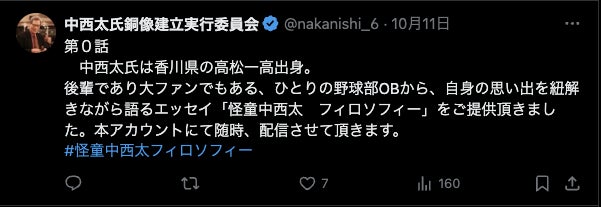 昨年の中西さんのお別れ会の時にご来場された栗山英樹氏が「中西さんの銅像を建立したい」とおっしゃっていた話を耳にした時、いつかそうなったら良いなと思っていましたが、まさか、こんなに早く実現に向けて動き出すとは!令和9年夏、高松市中央公園に水原氏・三原氏の銅像とともにそびえ立つ中西さんの銅像を想像すると、とても楽しみでなりません。