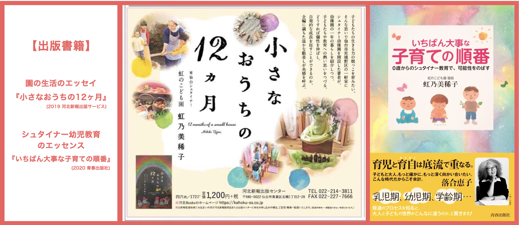 2019年には季節の暮らしをていねいに味わう園生活を新聞に連載したエッセイをまとめた「小さなおうちの12ヶ月」(河北新報出版サービス)、2020年にはシュタイナー幼児教育のエッセンスを誰にでもわかりやすく、読みやすい子育て本としてまとめた「いちばん大事な『子育ての順番』」(青春出版社)を出版し、子育て中の方はもちろん、保育・教育現場に立つ先生方や医療や療育の現場で子どもに関わる仕事をされている方に、幅広く愛読していただいています。