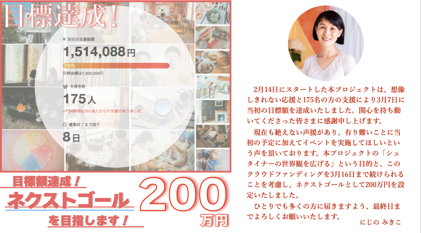 2025/03/08 00:44おかげさまで、クラファン挑戦22日目にして150万円の目標額に到達しました!ここまでいち早くご支援くださった皆さん、本当にありがとうございます。お一人おひとりに、お目にかかってお礼を申し上げたい気持ちです。園のあれこれもありまして、当初の予定からだいぶずれ込み、一年でいちばん忙しい卒園前の年度末に重なってしまったため、日々は保育の仕事で手一杯な状況となっておりまして、お礼を申し上げるのも遅れてしまっており申し訳ありません。いよいよ来週の卒園を前に、園では卒園制作やアルバム作りなど佳境に入っております。そしてそんな園の暮らしと同時並行で、プロジェクトの講演ツアーの準備や、ショートムービー制作も順調に進んでおります。講演ツアーは3/22より31まで、東京〜山梨〜神奈川〜宮崎〜熊本で全9ヶ所開催予定です!すでに主催の方々とのやりとりを通して、たくさんの熱が伝わってきて、もうすぐ会える皆さんとの時間がとても楽しみです。ショートムービーは、園の暮らしとともに、私の暮らしにもカメラが入っております。どんな映像になるのか、、、私もとても楽しみです!あと9日!ここまで皆さんに頂いた熱の大きさに圧倒されながら、ここまで17年間小さくとも守り育ててきた灯火を、皆で大きく囲むキャンプファイヤーに育てて、みんなで暖まっていこう、そんな気持ちで最終日まで向かいたいと思います!引き続き、お見守りください!感謝をこめてにじの みきこ もっと見る
