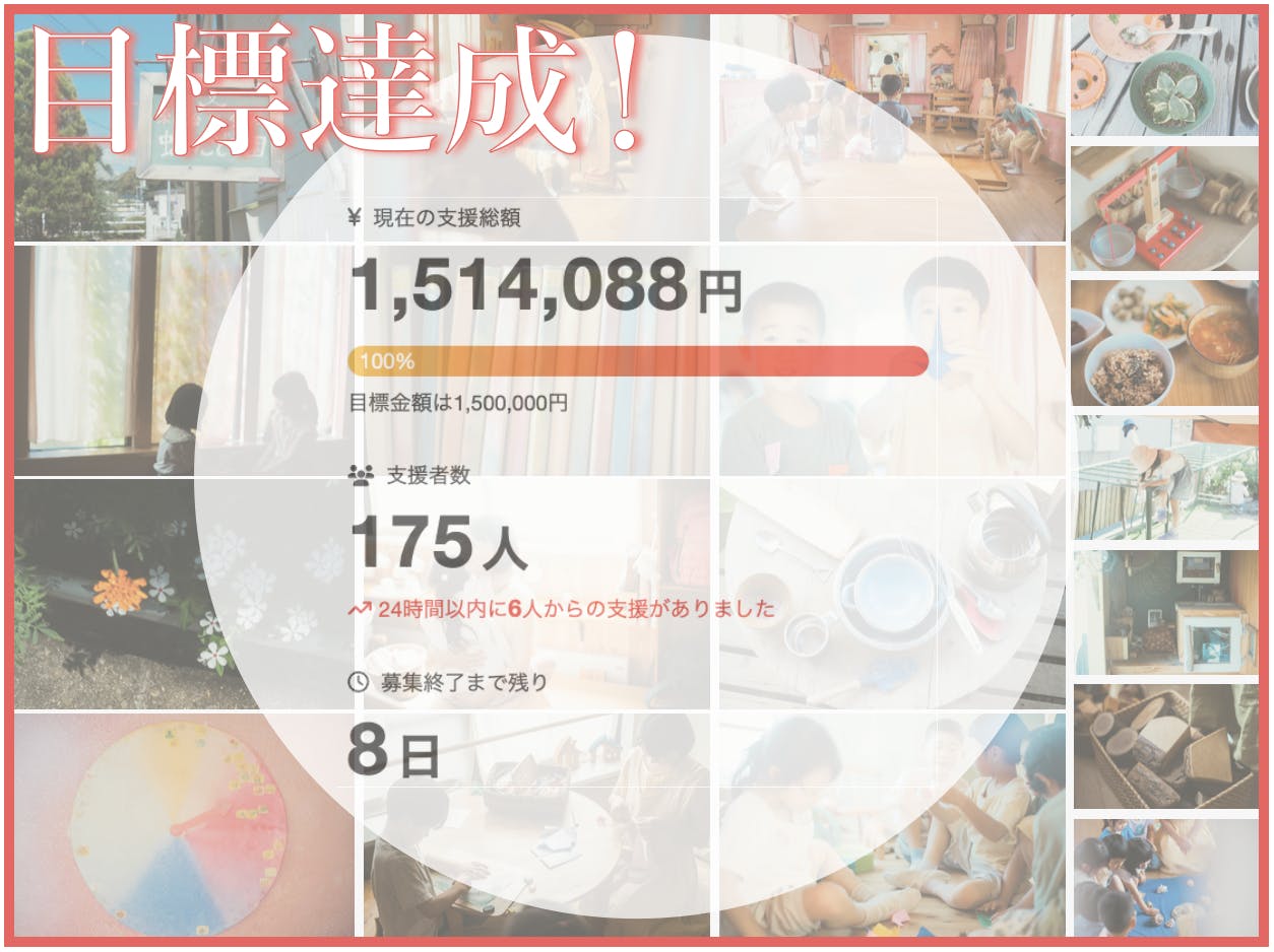 2025/03/08 00:44おかげさまで、クラファン挑戦22日目にして150万円の目標額に到達しました!ここまでいち早くご支援くださった皆さん、本当にありがとうございます。お一人おひとりに、お目にかかってお礼を申し上げたい気持ちです。園のあれこれもありまして、当初の予定からだいぶずれ込み、一年でいちばん忙しい卒園前の年度末に重なってしまったため、日々は保育の仕事で手一杯な状況となっておりまして、お礼を申し上げるのも遅れてしまっており申し訳ありません。いよいよ来週の卒園を前に、園では卒園制作やアルバム作りなど佳境に入っております。そしてそんな園の暮らしと同時並行で、プロジェクトの講演ツアーの準備や、ショートムービー制作も順調に進んでおります。講演ツアーは3/22より31まで、東京〜山梨〜神奈川〜宮崎〜熊本で全9ヶ所開催予定です!すでに主催の方々とのやりとりを通して、たくさんの熱が伝わってきて、もうすぐ会える皆さんとの時間がとても楽しみです。ショートムービーは、園の暮らしとともに、私の暮らしにもカメラが入っております。どんな映像になるのか、、、私もとても楽しみです!あと9日!ここまで皆さんに頂いた熱の大きさに圧倒されながら、ここまで17年間小さくとも守り育ててきた灯火を、皆で大きく囲むキャンプファイヤーに育てて、みんなで暖まっていこう、そんな気持ちで最終日まで向かいたいと思います!引き続き、お見守りください!感謝をこめてにじの みきこ もっと見る
