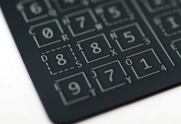 このデジタルの時代、あえてアナログなカードだからハッキングされない安全性。このパスワードを生成するためのカードは2つとして同じものが存在しません。数字、大文字、小文字、特殊文字の組み合わせは無限です。傷・汚れ・指紋に強いアルマイト処理されたアルミニウム合金だから、印字が削られる心配もなし!