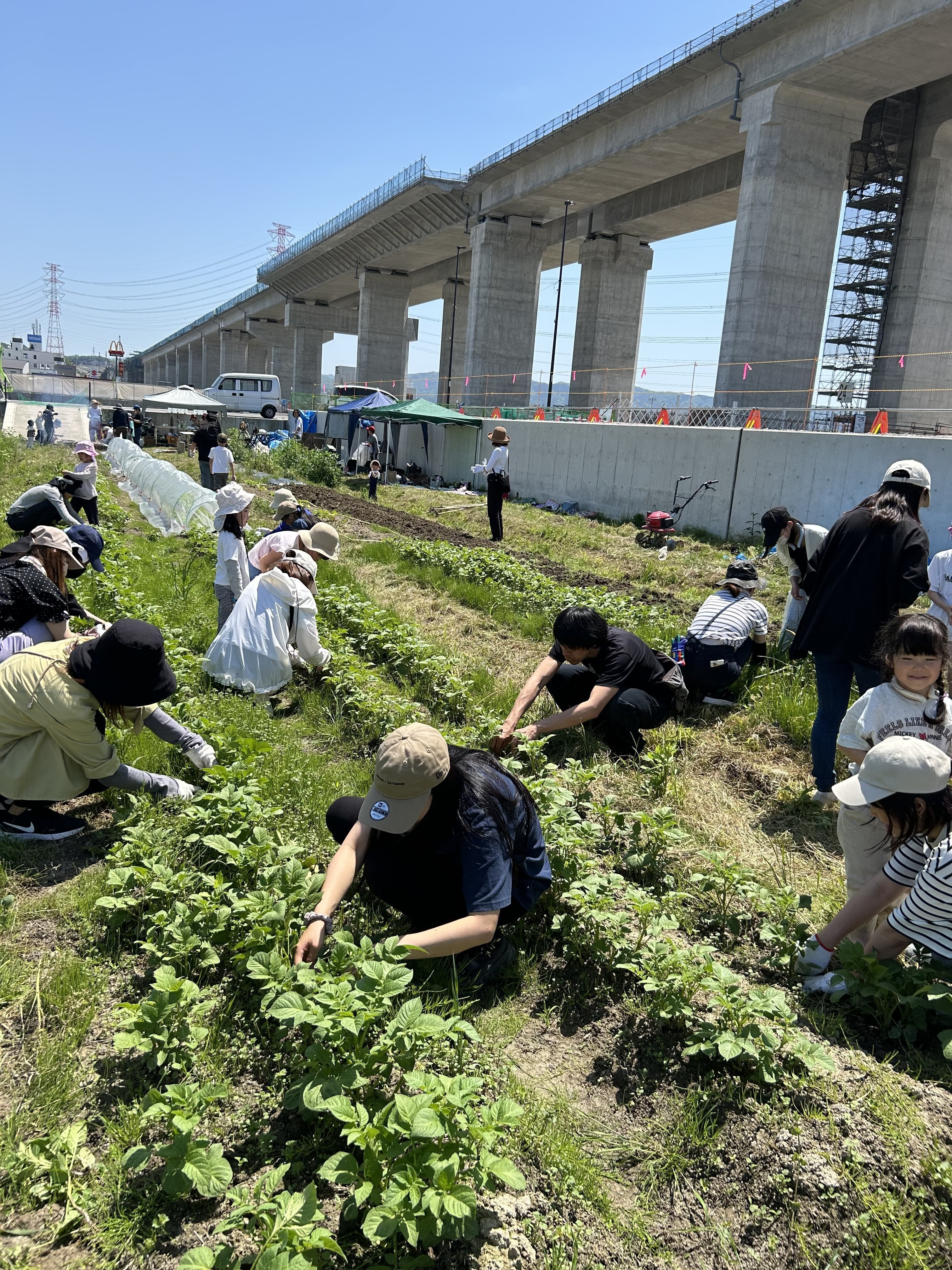 畑で子ども食堂では50名近くの親子が畑仕事で汗を流しつつ