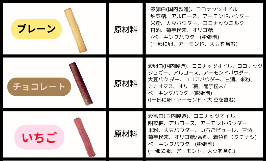 - 大豆たんぱく(国内製造)、難消化性デキストリン、そら豆たんぱく、 酒粕粉末、モリンガ葉末、植物発酵エキス末、L‐シトルリン、田七人参末、ウコン末、アサイー果汁末、カムカム果汁末、マカ末、クコの実末、マキベリー末、カボチャ種子エキス末/甘味料(ステビア)、ヘスペリジン、(一部に大豆・オレンジ・キウイフルーツ・バナナ・もも・やまいも・りんごを含む)