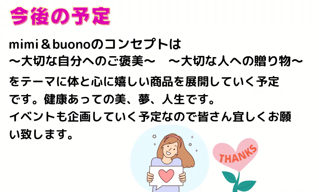 ブランド名の「mimi&buono』についてmimiとはフランス語で「愛おしい」「大切な存在」buono は「おいしい」という表現の時にもちいられます。