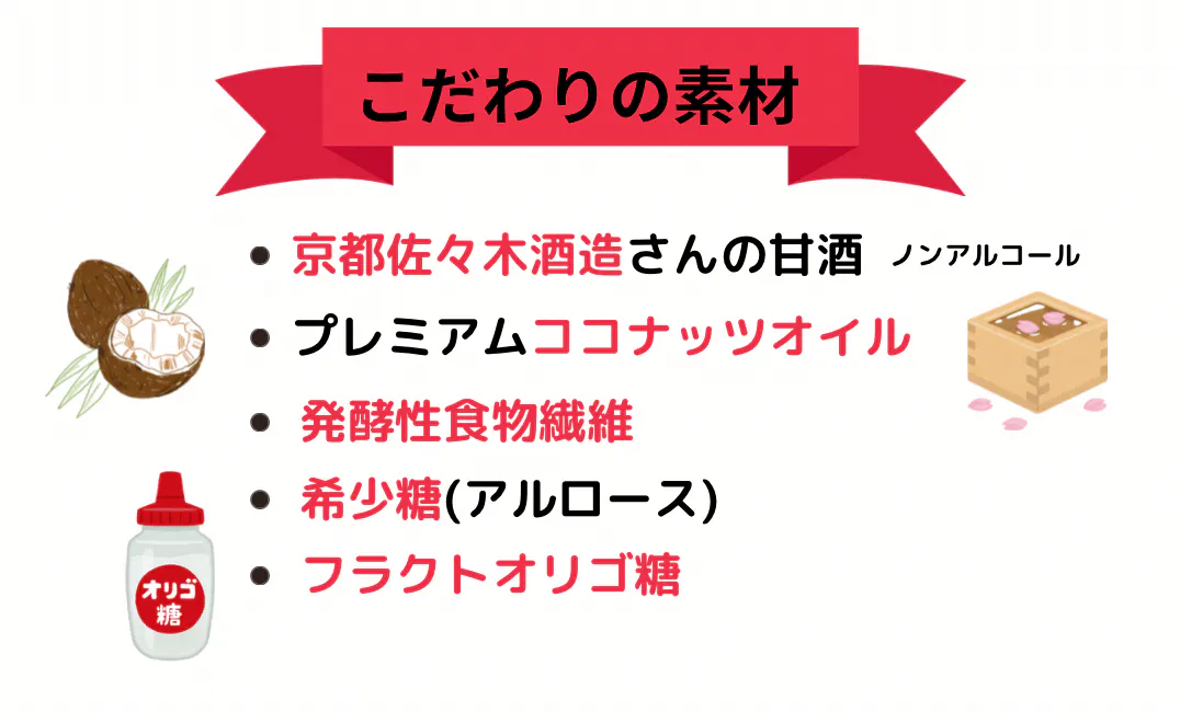 まず、京都佐々木酒造さんの甘酒を使用しています。この甘酒は、伝統的な製法で作られており、自然な甘さと豊かな風味が特徴です。