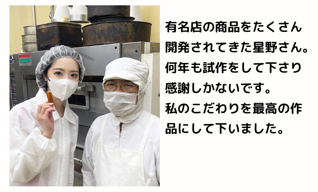 製造を手掛けてくださった星野さんは、長年にわたり有名スイーツ店の数々の作品を誕生されてる熟練の製造者です。今回も私の理想を実現するために多大な協力をいただきました。「おいしい」と心から納得できるまで、決して妥協せず、最良の味を追求してくれました。