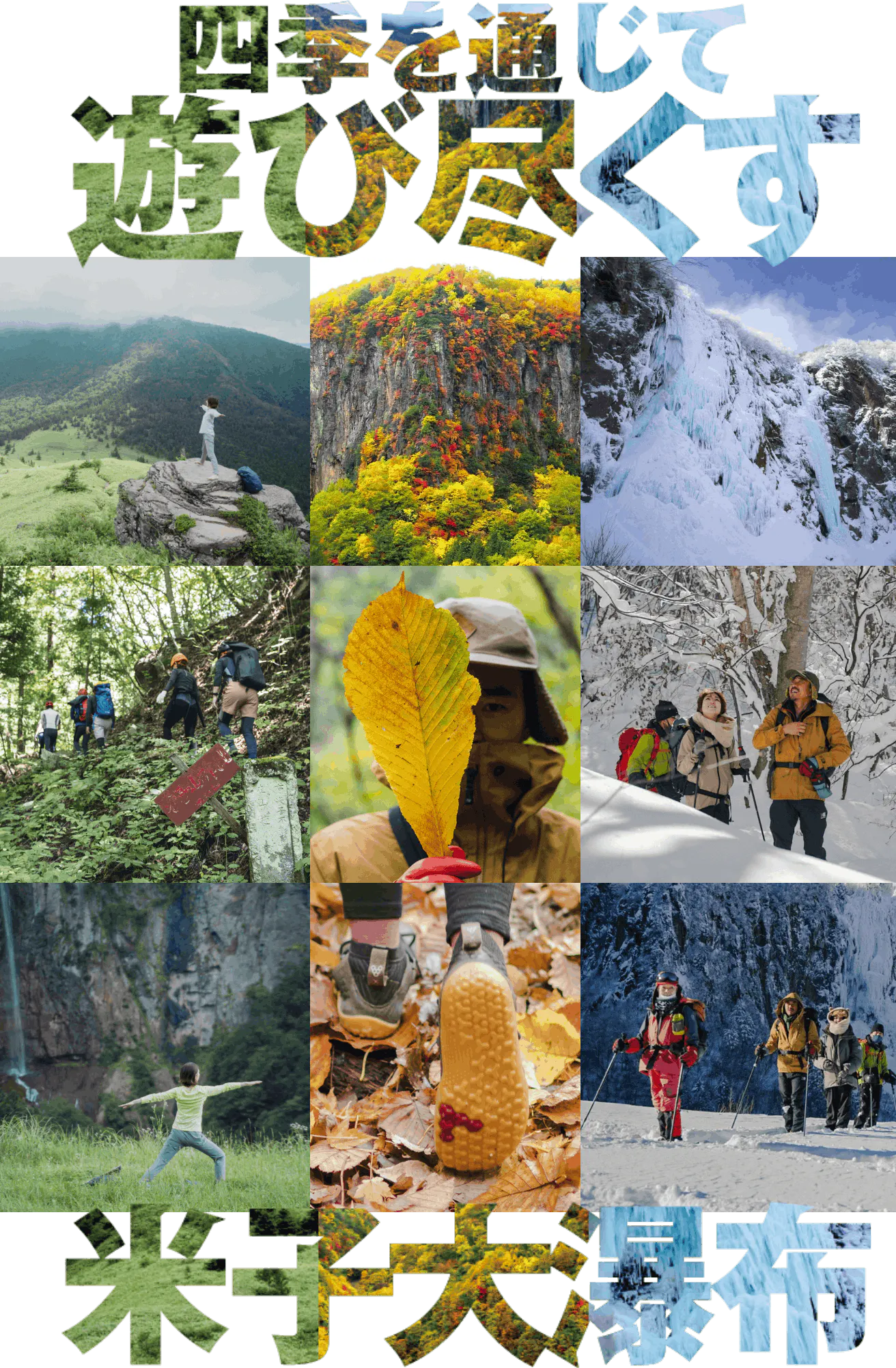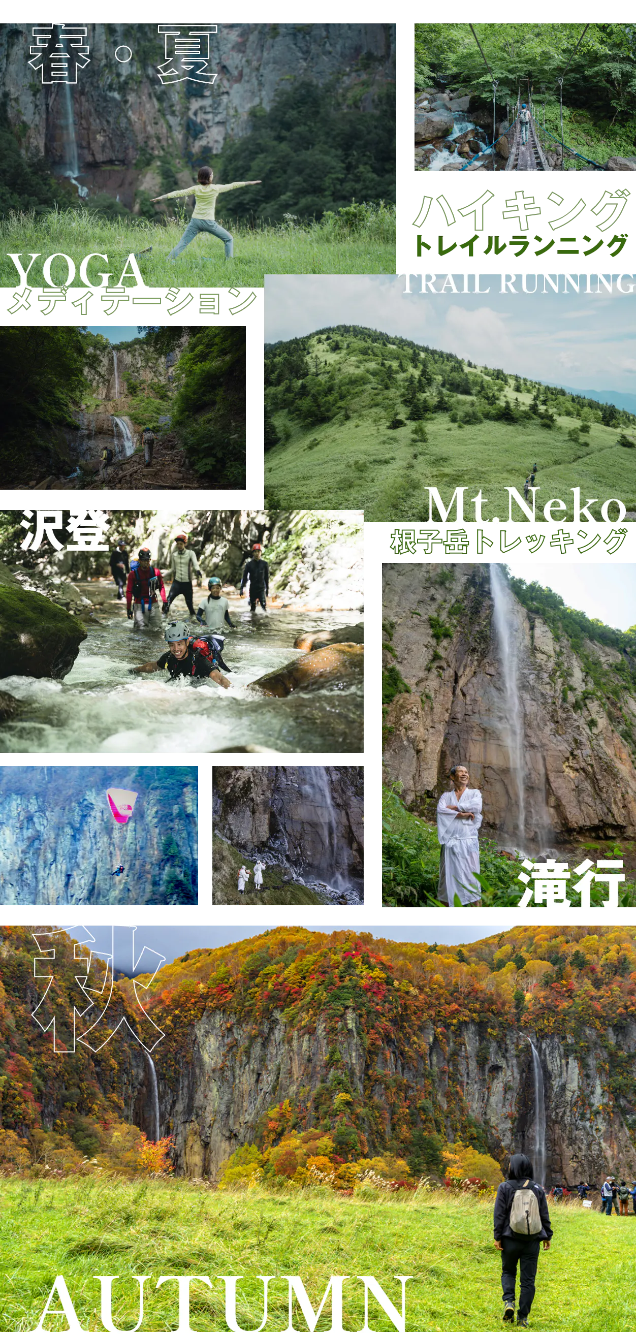 自然の恵みが浸みだしてくるここ米子大瀑布は、日本屈指のアウトドア・アクティビティ拠点となる可能性を秘めています。その選択肢は豊富で、春夏はキャンプ、ハイキングやトレイルランニング、沢登り、キャニオニング。冬は山スキー、スノーシューによる100mにもなる大氷瀑の見物。さらにはスピリチュアルな滝行など、一般にはまだ知られていない、傑作な自然の中を冒険するプログラムの設計が可能です。