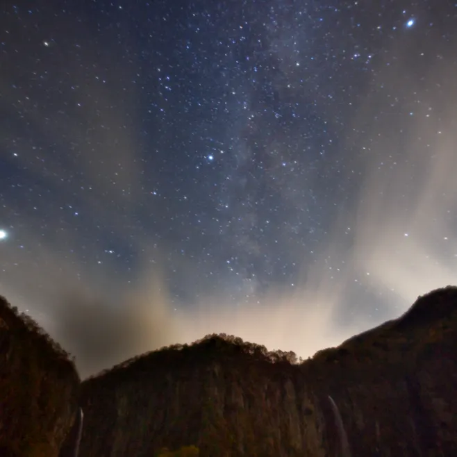 米子大瀑布には宿泊しなければ体験できない魅力があります。夜は静寂の中に響き渡る滝の音、断崖絶壁の上に広がる星空はどこまでも続き、自然の叡智が感じられ感動的です。
