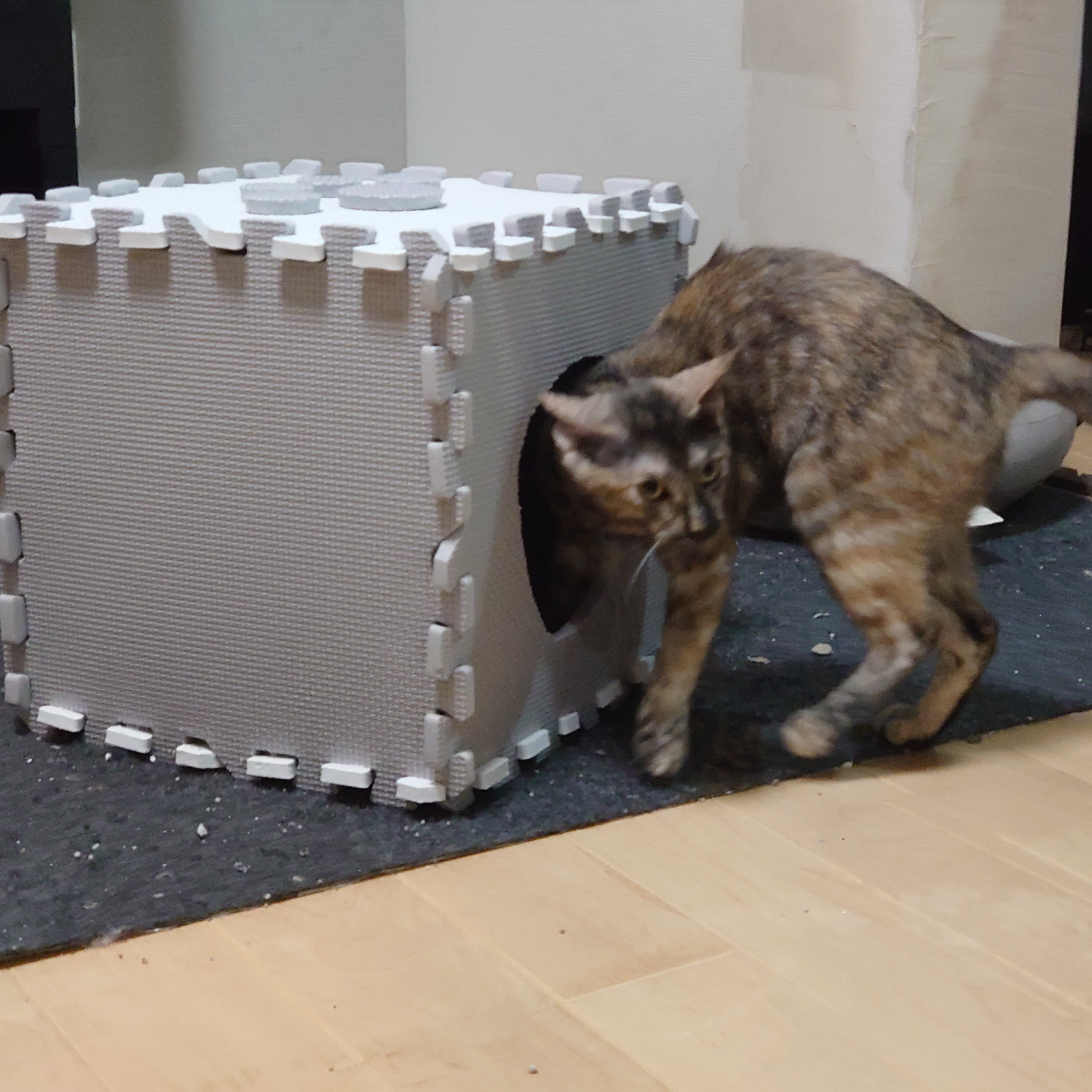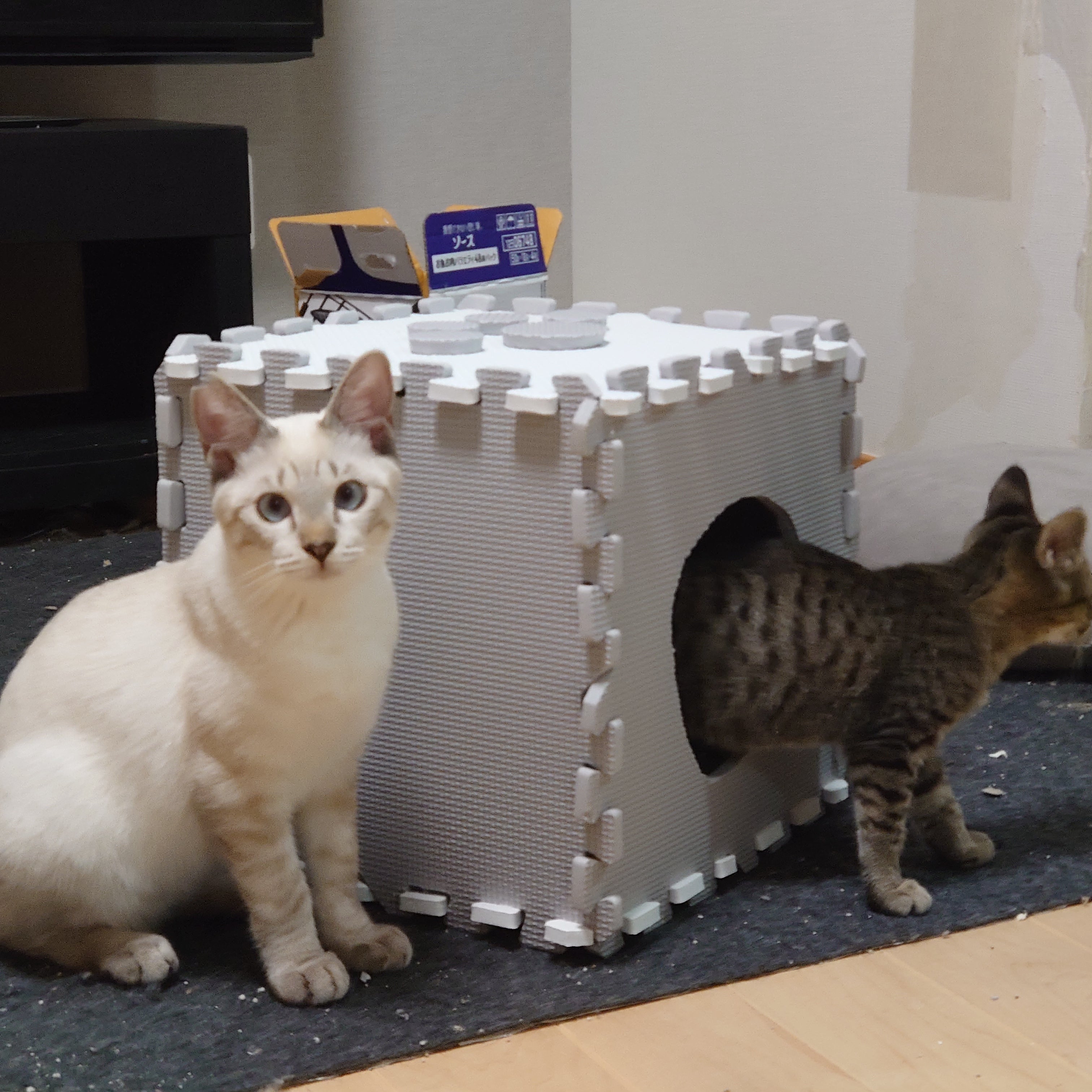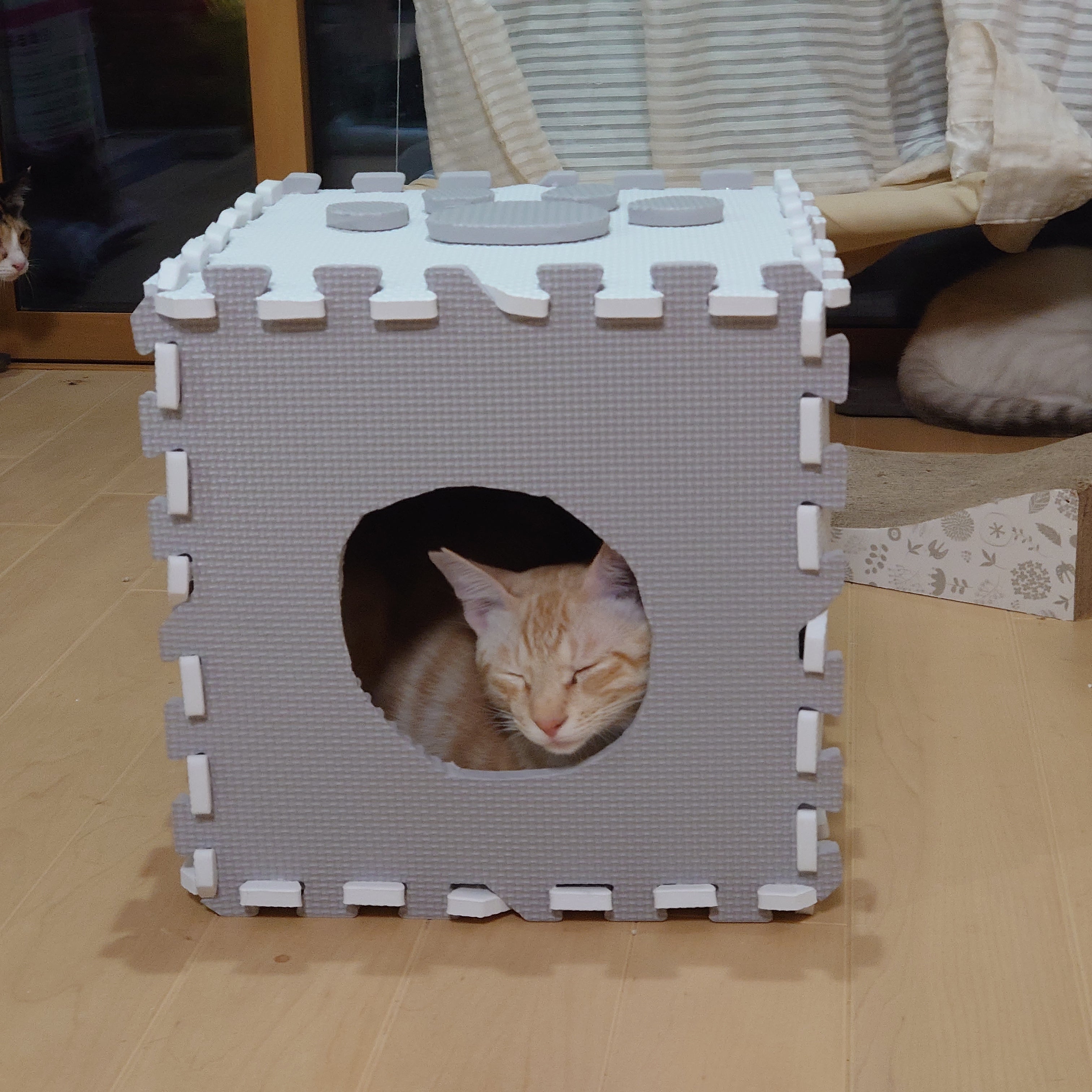 先日作った簡易お部屋は、最初は警戒してましたが今では入ってくれたり上に乗って寝たりしてくれています。