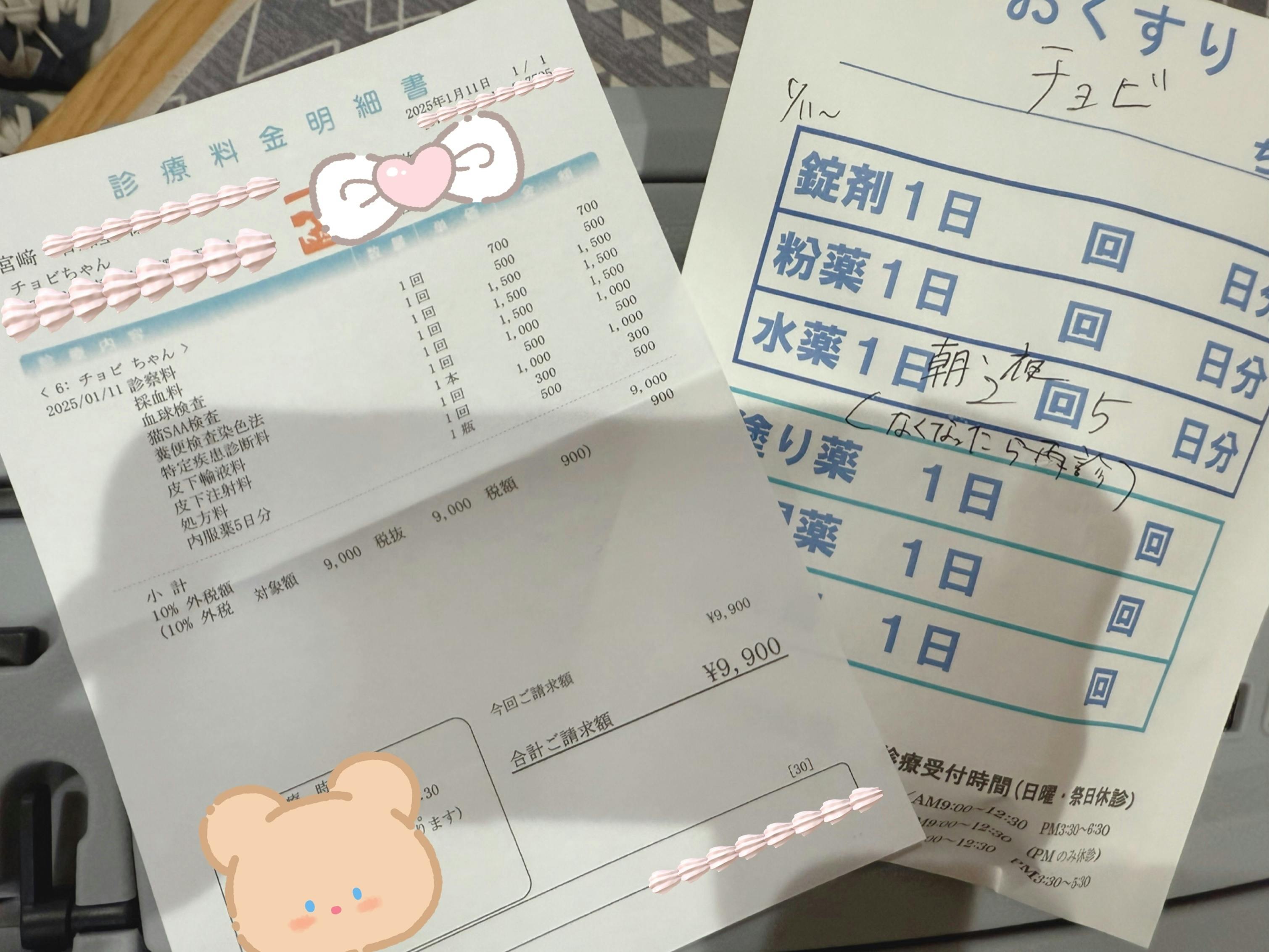 やはり少し脱水を起こしていたので抗生剤と脱水の注射を打ち、飲み薬を処方してもらいました。