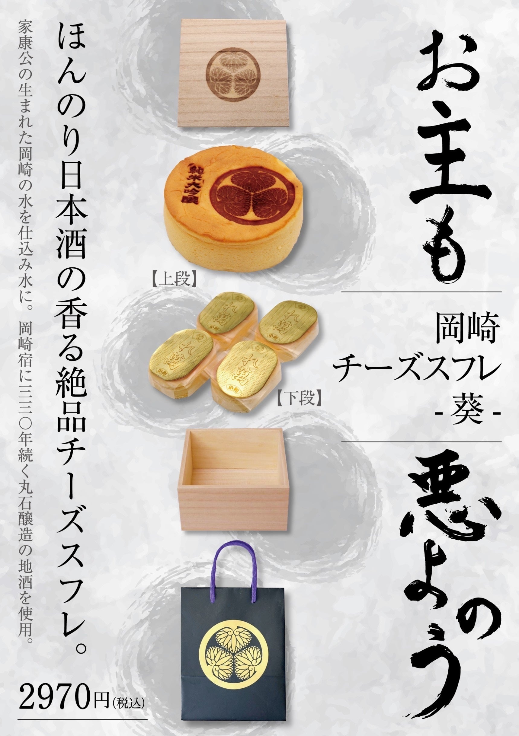 このチーズケーキは、ふわふわとしたスフレチーズと丸石醸造さんの「徳川家康大吟醸」の華やかな香りが絶妙に調和した、濃厚な味わいが特徴です。