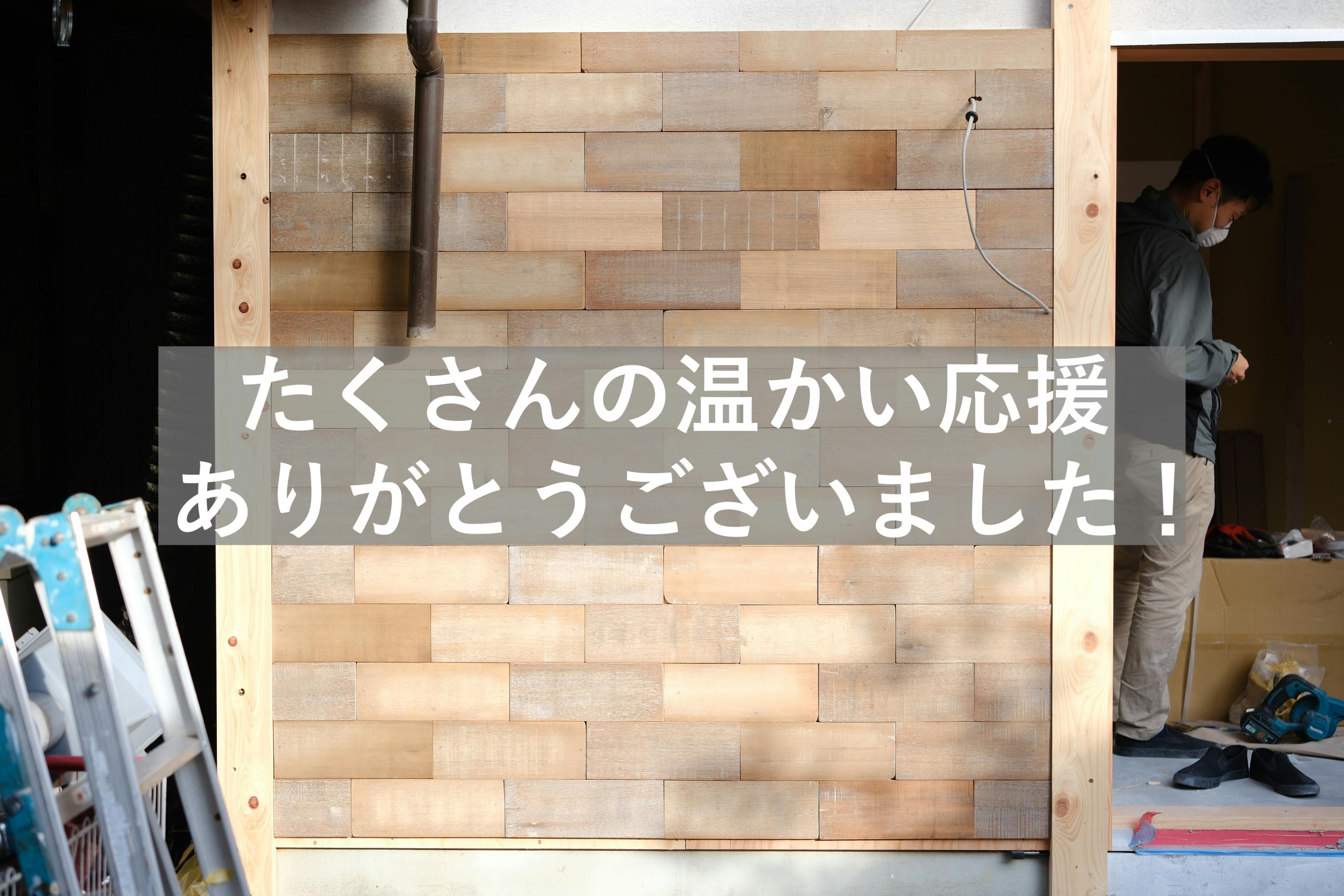 2024/10/24 21:01こんばんは!elämää setoの野﨑由衣です。昨日夜、42日間のクラウドファンディングが終了となりました。117名もの方々の温かいご支援で、目標金額を大きく超えるゴールを切らせていただきました!心よりお礼申し上げます。リターンも最終的に全種類選んでいただくことができ、とっても嬉しいです。11月以降になりますが、順次ご案内していきますので、楽しみにお待ちいただけますと幸いです。(提供時期はリターンにより異なりますので詳しくは各リターンをご確認くださいませ)最近の現場の様子をご紹介しますね。トップの写真はお店入り口横の外壁で、これは先日頑張って磨いたモロ板がタイルのように組み合わされています。この「木タイル」は始めから外壁のためにカットされたものではなく、天井に使用したモロ板の端材部分なのです。つまり、モロ板を天井に使用することが先に決まり、余った部分の活用として出てきたアイディアです。作る過程で現場から新たな資材が生まれて行く様子をよく伝えている壁で、そんなところが推しポイントです。そしてこちらは本日の写真です。お店に入ってすぐ左手にあるカウンターとキッチンスペースです。仕切り壁やカウンターも、枠材以外は古材を活用していて、モロ板の二次利用やさらにその先の事も含めて考え作られています。詳細はプレオープンやマルシェの時に、設計を担当された中渡瀬さんを捕まえてぜひ聞いてみてくださいね。今日は私もドライバーを持ち、キッチンのウエスタンドア取付けに挑戦しました。素人なので多少不恰好になってしまいますが、自分で手を加えると愛着も増します。少しのことは自分で何とかする精神を磨く機会でもあります。皆さまからのエールや、お手伝いいただく方々の心強いサポートのおかげで、店舗作りは順調に進んでいます。喜んでいただけるお店にしていきたい!という想いを日に日に強くしています。クラファンを通しての応援、本当にありがとうございました。どうぞ、オープンを楽しみにしていてください!今後とも、どうぞ宜しくお願いいたします。 もっと見る