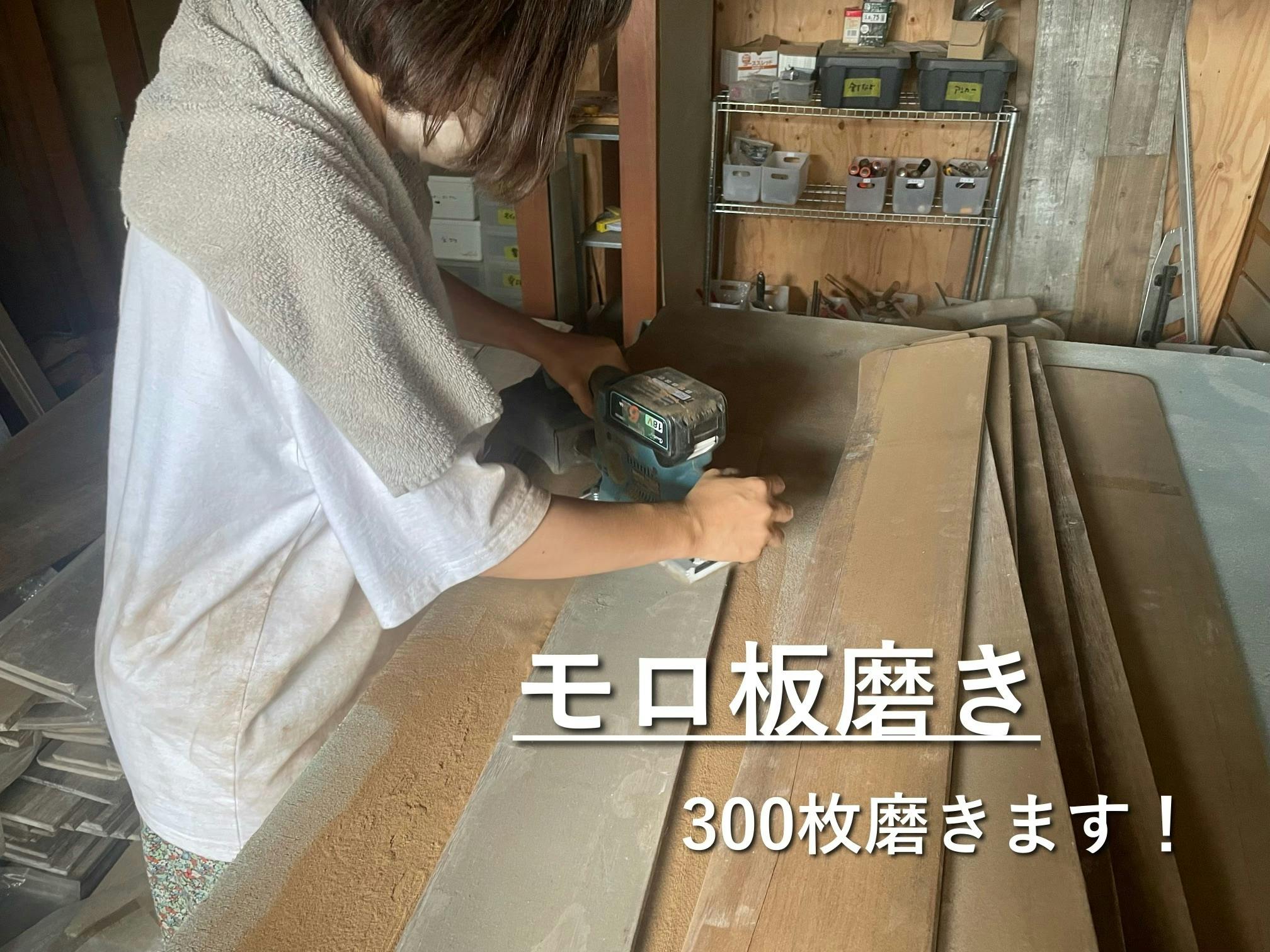 いただいてきたモロ板は、汚れを落とし、磨き、そして製材した上で店内の天井やカウンターなどに生まれ変わります。その数なんと約300枚!写真は電動ヤスリを使って磨いているところです。