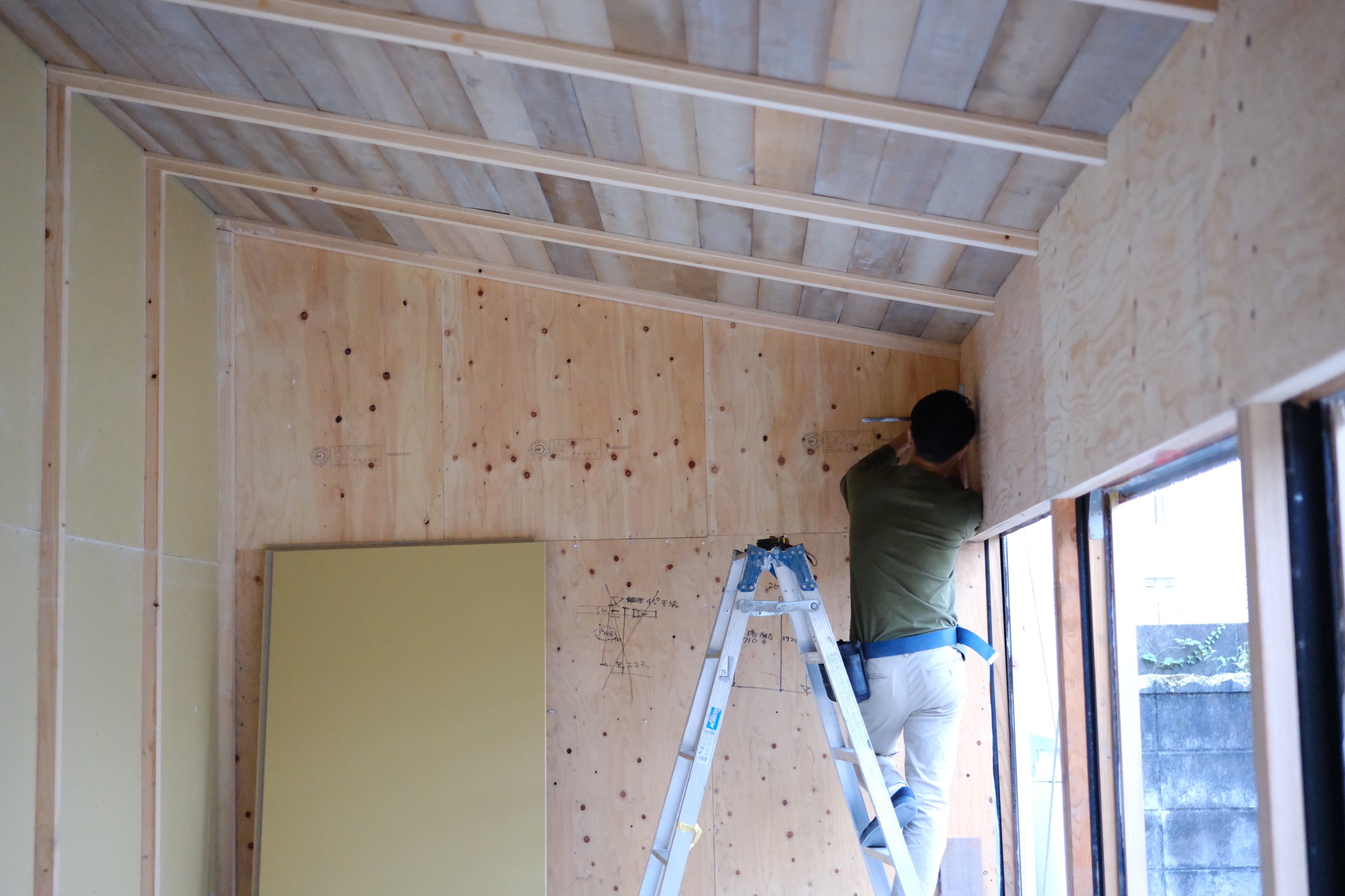 店舗の施工が日々進んでおりまして、壁にはボードが貼られ、天井にはモロ板が掛かりました。とっても素敵な空間になりつつあります。