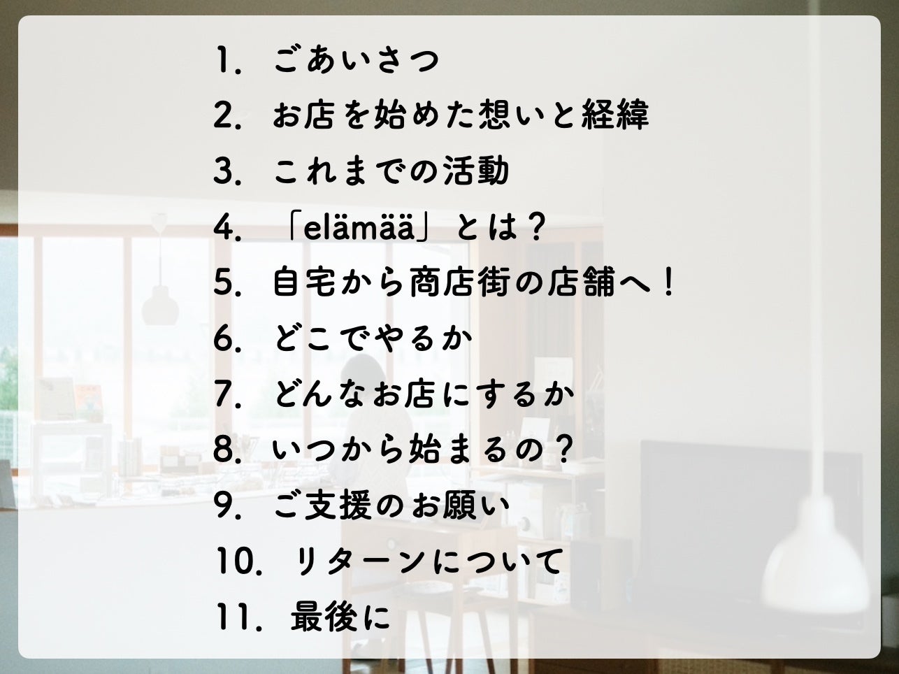 屋号にした「elämää」とは暮らし・生き方・人生などの意味を持つフィンランドの言葉です。子ども達が今よりももっと幼く一番子育ての過酷さを感じていた頃、子どもの幸福度が高いと言われるフィンランドを家族で訪れました。現地の方と話した際、周囲と対話を重ねて自分たちの暮らしを主体的に作り上げていく日常というものその方のお話から感じ、とても印象に残りました。