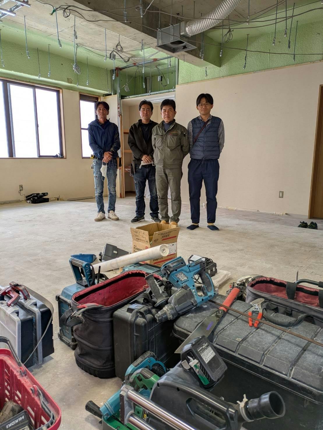 右から2番目。現地で建築マネジメントしてくださる有限会社東広島内装センターの中坂さん。包容力あふれる優しくて実直、誠実な方。工事初日、若い衆を連れて荷物搬出をする姿が印象的でした。20歳のスタッフに慈愛に満ちたお声がけをなさっている。若い人を育てる心意気を学びました。