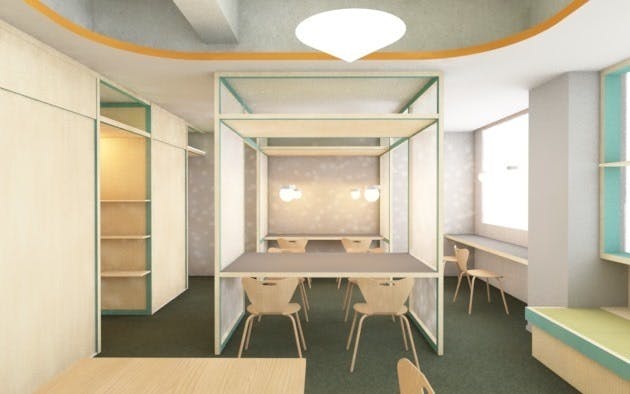 そして、かわいさを大切にしました。かわいい要素は、緊張感を与えない親しみ安さ、居心地のよさをつくります。カラーバランスも落ち着きと楽しさが感じられるように、照明器具もこの理由からペンダント型とし、空間に華やかさを加えています。