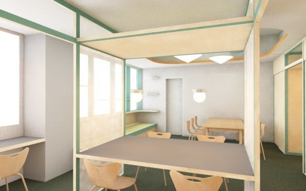 ここくらたビルは市役所や文化施設の集まる町の中心地に位置し、イノベーションラボミライノも目と鼻の先という好立地です。ここで、シェアオフィスの需要が果たして本当にあるのかという不安は、このような立地条件に加え、2023年から先生がイベント等の活動を地道に積み重ねる中で、関わる人がどんどん増えていくという成果を見て、いまこの地域に足りない、新たな場所への期待を感じました。新たな場所への期待のつぼみを花咲かせる一助となることを願い設計しました。