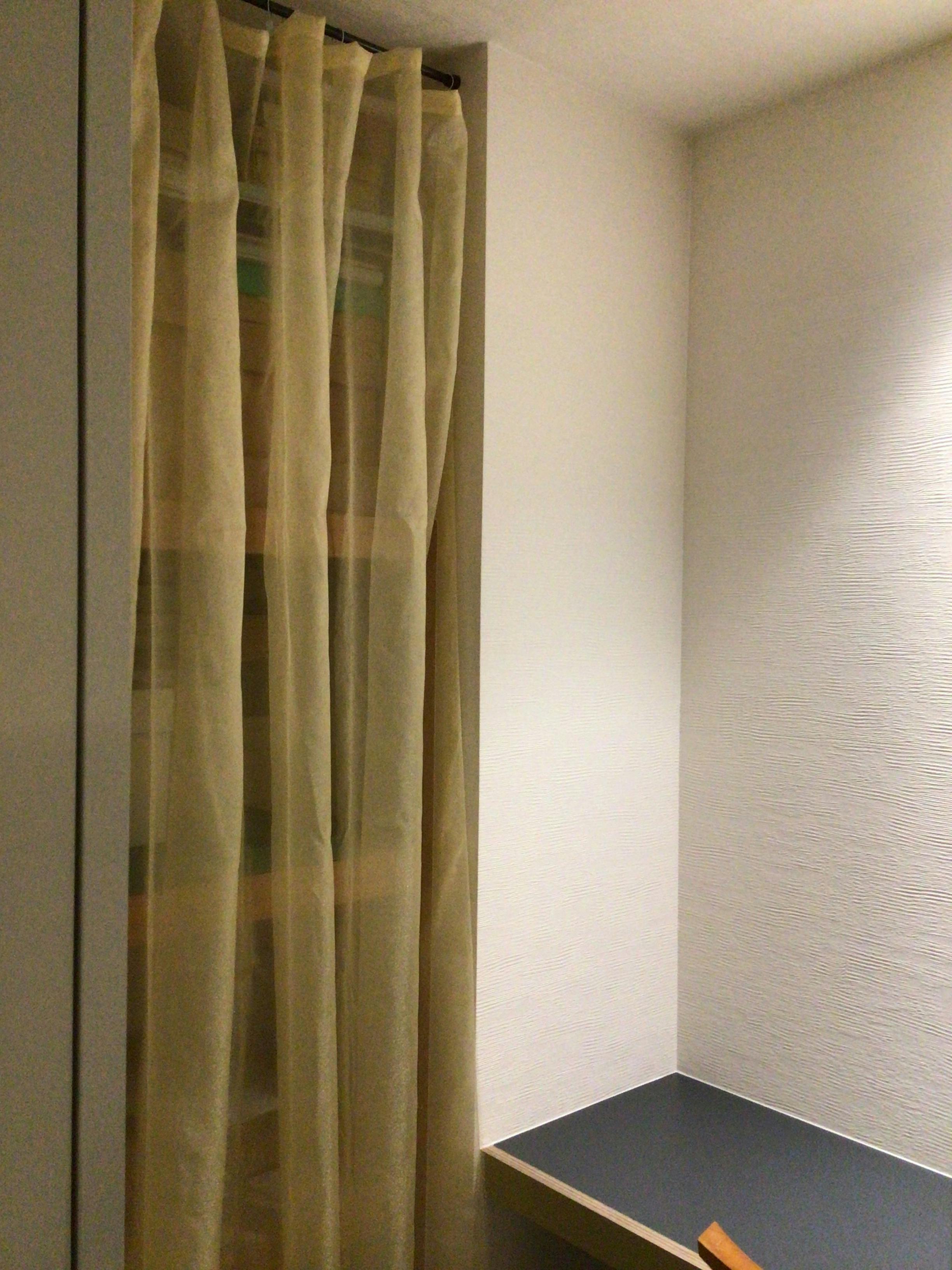 オフィスは片付きましたが、バックヤードに目隠しカーテンが必要です。間に合わん。カーテンは高い!来音入り前の夜梅田のユザワヤに行き、メートル480円の生地を4メートル買い、自分で縫うことにしました。