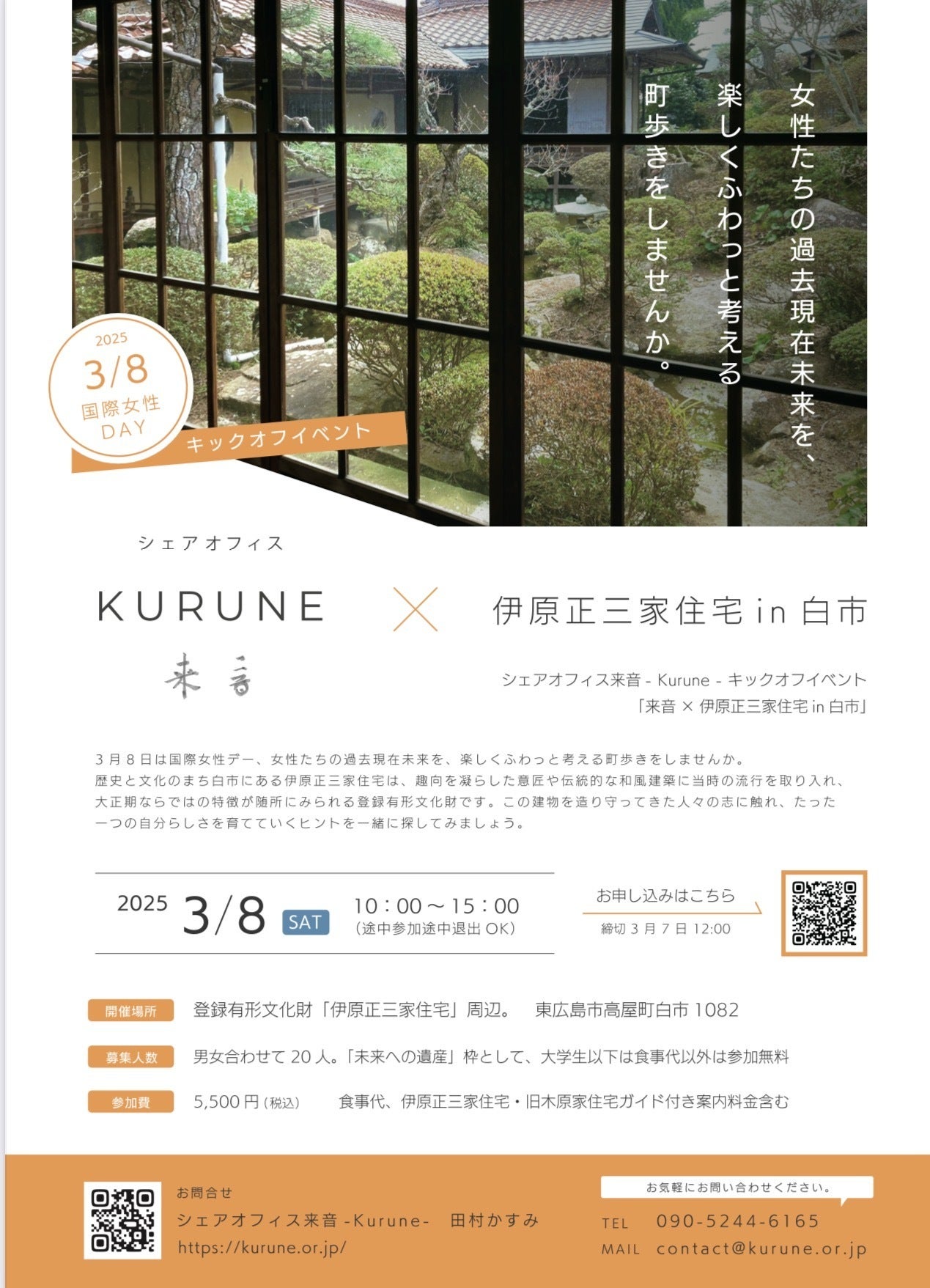 6月14日(土)の開業まであと4ヶ月となりました。立春をすぎ、水面下でじっくりと動いていた来音はゆるりと活動を始めます。来る3月8日(土)、東広島市にてキックオフイベント「来音×伊原正三家住宅 in 白市」を開催します。国際女性デーにちなみ、女性たちの過去現在未来を楽しく、ふわっと考える企画です。国の登録有形文化財である伊原正三家住宅の内覧や、城下町宿場町として栄えた白市の街並みを散策する楽しい一日を過ごしませんか。この企画、私自身がワクワクしています。みなさまに自信を持ってお勧めいたします。伊原家の聡子さんのご自宅のご案内、秀逸です。フランスボルドー在住の聡子さんは、ご実家の保存活用のために立ち上がった聡明で行動力ある女性。なんと、聡子さんのお着物コレクションの中には、くらた呉服店でのお誂えがあります。ともに母の代の遺産です。娘たちは近くに住んでいたというのに、全く面識はありませんでした。文化が取り結んでくれたご縁です。詳細をお知らせします。今感じている思いを、ゆるりふわりと参加者で共有できたらいいですね。 記日時:2025年3月8日(土) 10時から15時くらいまで場所:東広島市高屋町白市 伊原正三家住宅周辺集合:白市探訪駐車場内容:白市の町並み散策、伊原正三家住宅内覧、炭焼き・鉄板焼き「惣十郎」でランチ、座談会募集対象者:男女年齢を問わず20名。大学生・中高生もお越しください。参加費用:5500円(税込)。お食事代、旧木原家住宅観覧料、伊原正三家住宅使用料、お土産代を含む。ただし、大学生以下は「未来への遺産」として食事代のみのご負担となります。