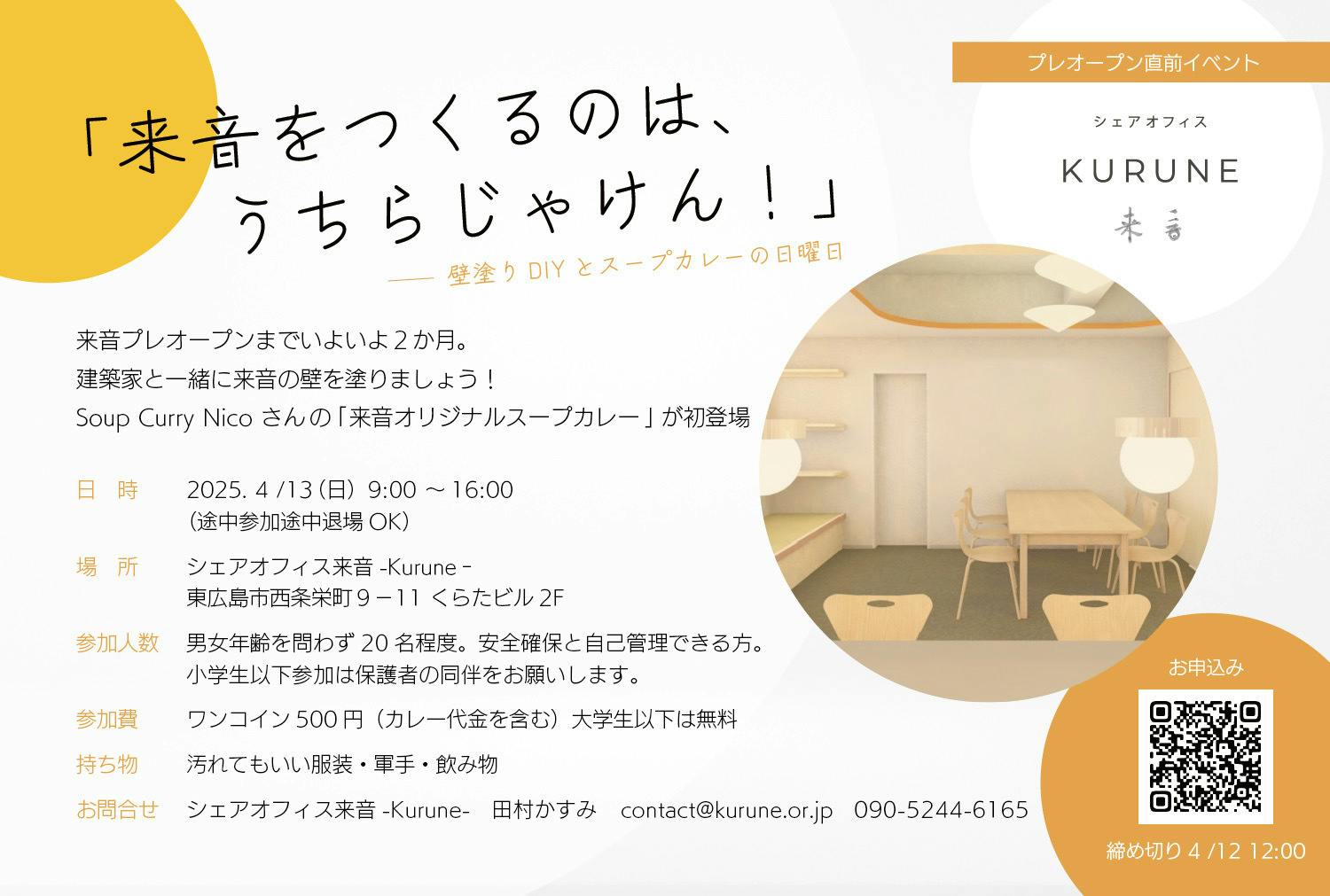 ・高品質でオトナ可愛いオフィス・女性が安心して安全に過ごせる場の提供・一人でも寂しくないどころか、心地よい集中ができて達成感が生まれる・オフィスから歩いて2分の場所に、24時間営業の大型スーパーとコンビニ・最寄り駅JR西条から歩いて7分の、東広島市街地の中心・キッチン、快適バスルームのある30畳のフロアもレンタルできます・お泊まりもミーティングもできます。合宿、女子会、研修会。なんでもござれ!・お泊まりは3部屋分の個室・夜になると安全なのに静か・広島大学にはバスで10分・都心からだと飛行機で広島空港までひとっ飛び→リムジンバスで20分で西条駅→歩いて7分で来音に来るね・海あり、山あり、野菜あり、おいしい日本酒ありグランドオープンまではテストランをしています。モニター価格で来音のファンになってください!詳細は後日ね。適度な距離を保ってくれる優しいエリアマネージャーと、給食のおばちゃんがお待ちしています。