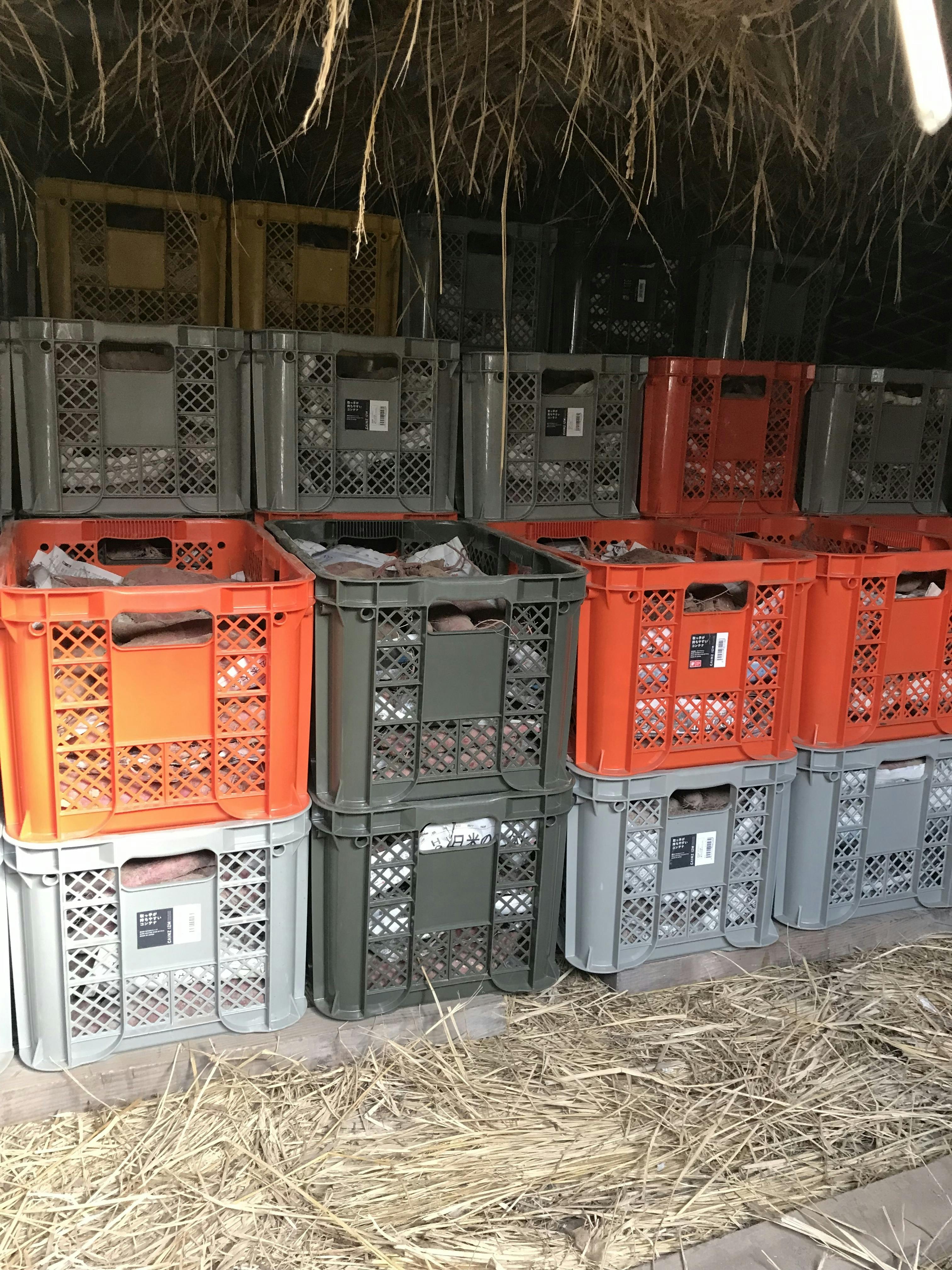 本日お芋のコンテナを地下の貯蔵庫(ムロ)にしまいました。写真は途中の状態ですが、6畳ほどの広さのムロの中に4段積んだ箱が口元までいっぱいになりました。