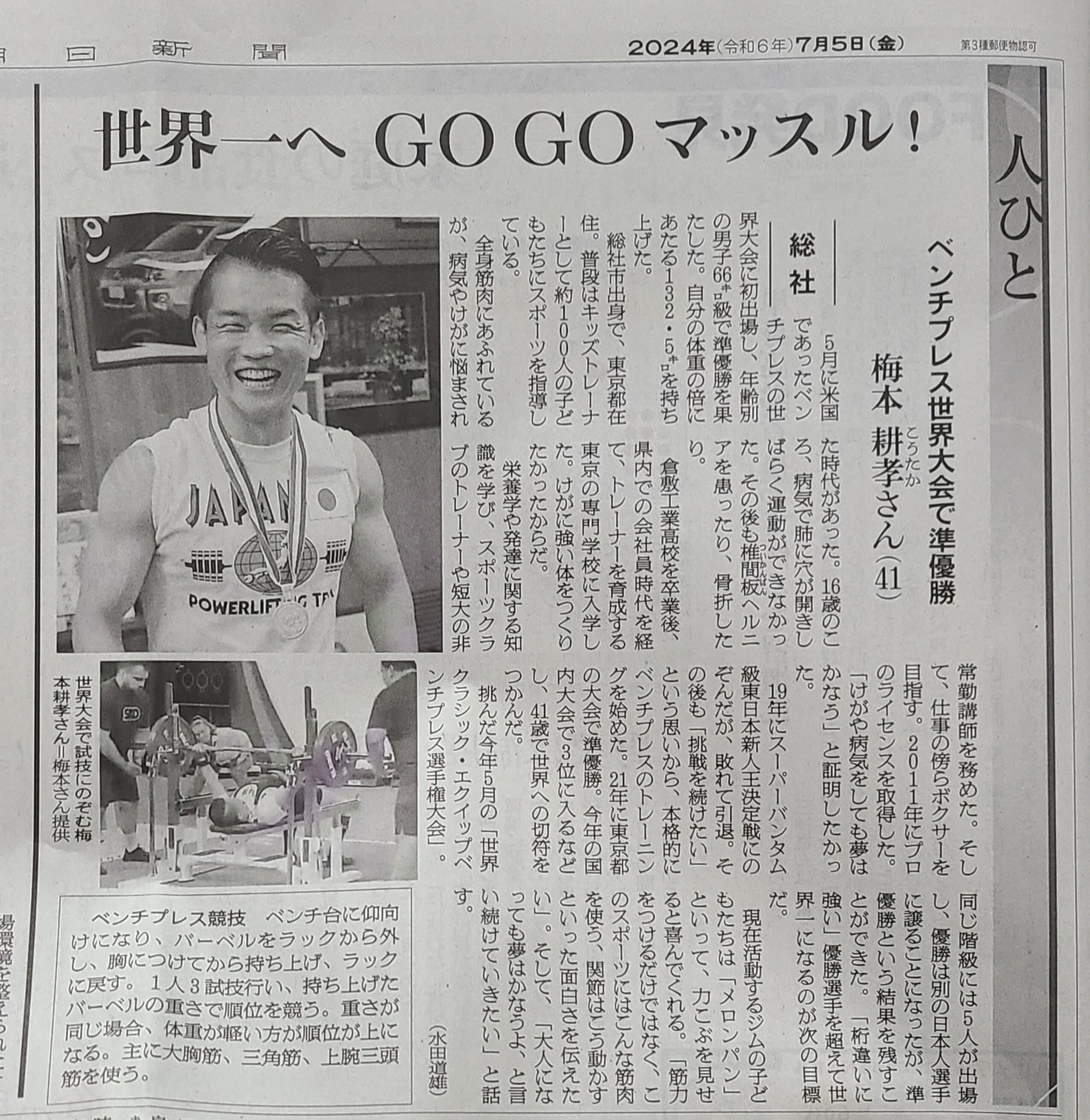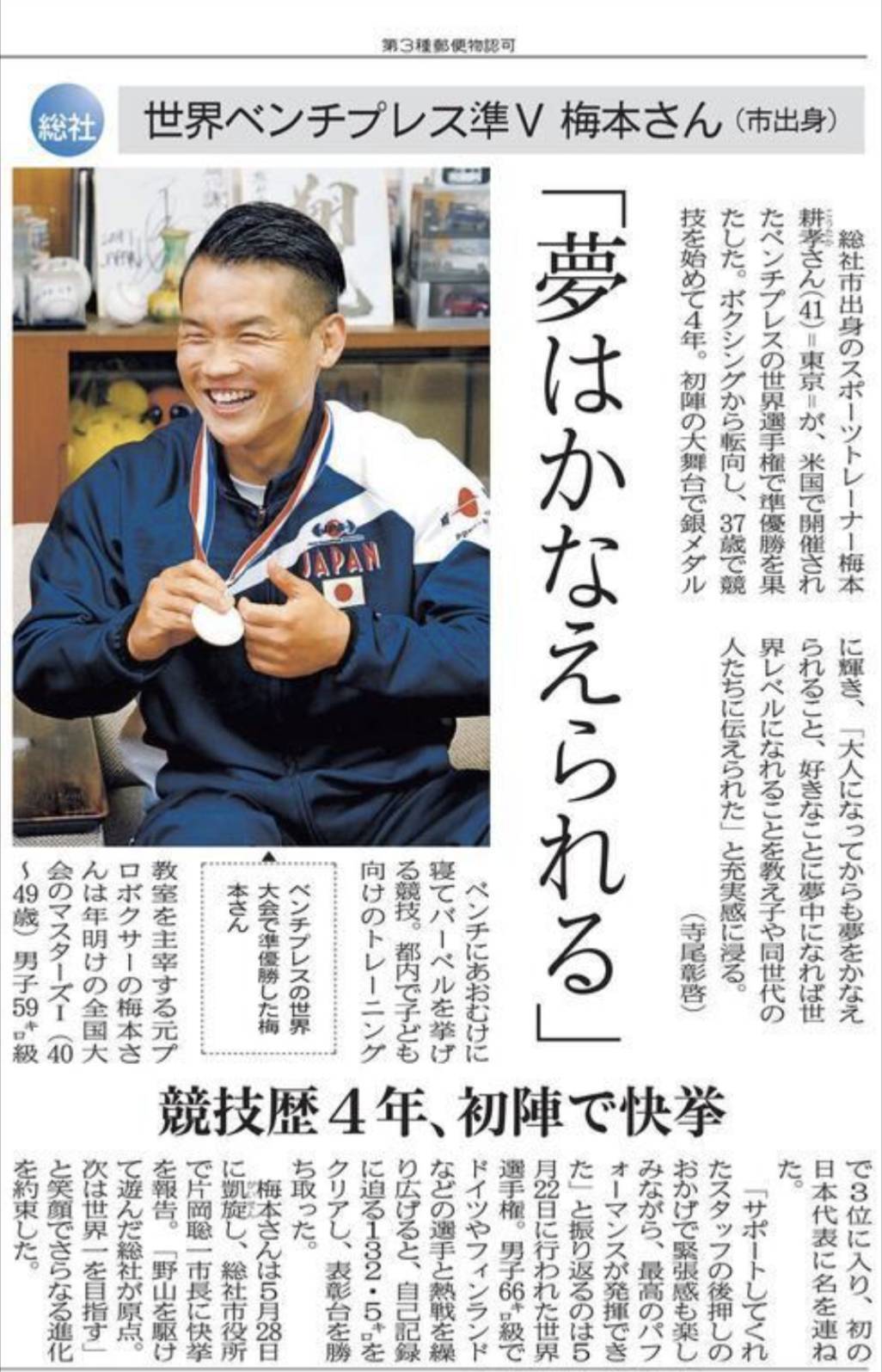 梅本耕孝(うめもと こうたか)と申します。37歳からベンチプレスという競技に本格的に取り組み、現在41歳で日本代表として活動しています。今年の世界大会では2位という結果を収めることができました。このプロジェクトを通じて、これからも挑戦し続け、来年の世界大会での優勝を目指しています。私は「大人になっても夢は叶う」というメッセージを子ども達に伝えています。