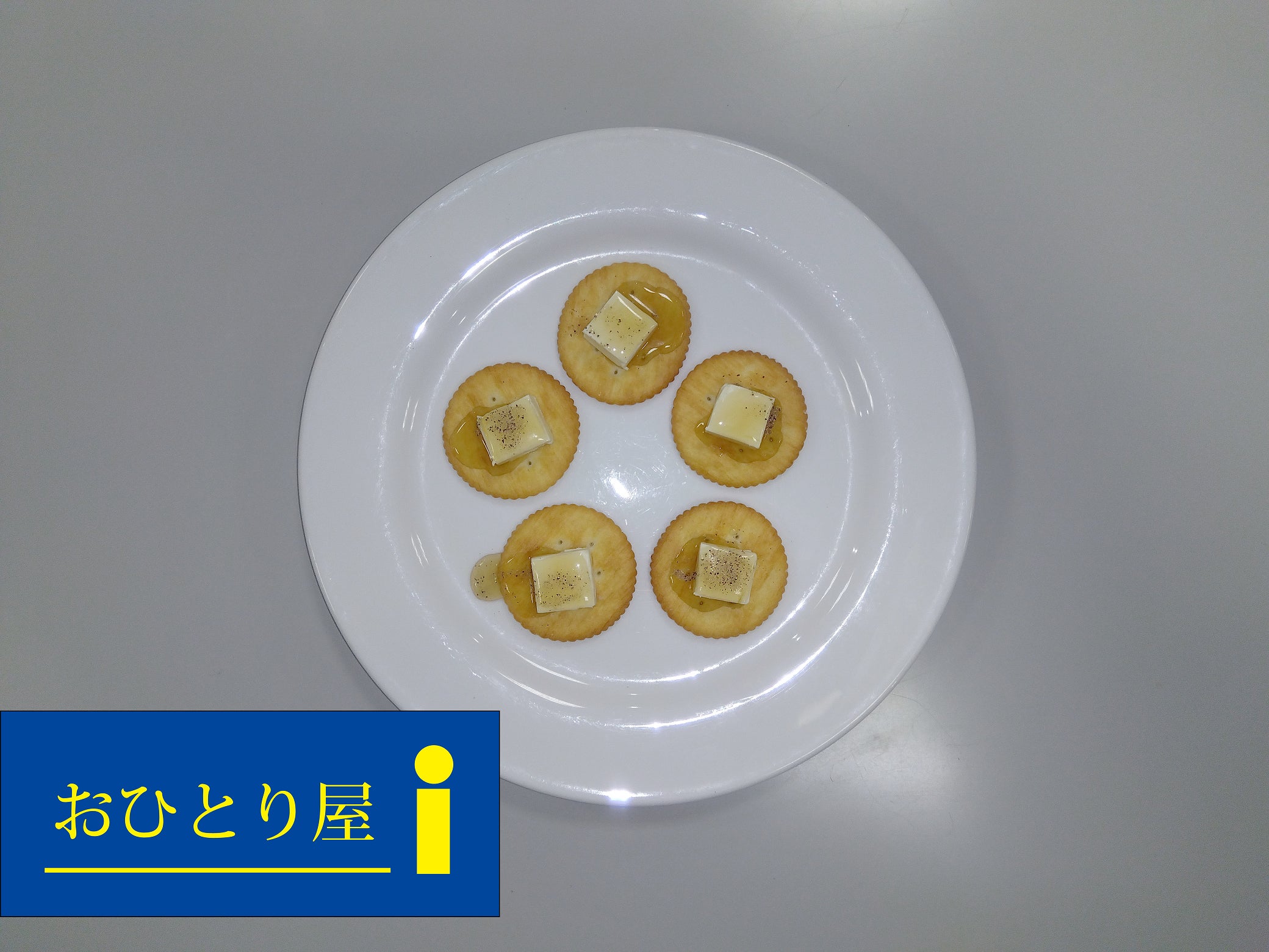 クリームチーズを乗せたクラッカーをハチミツと黒コショウで味付けしています。クリームチーズとハチミツと黒コショウが混ざり合うと想像を超えたハーモニーが醸し出されます。