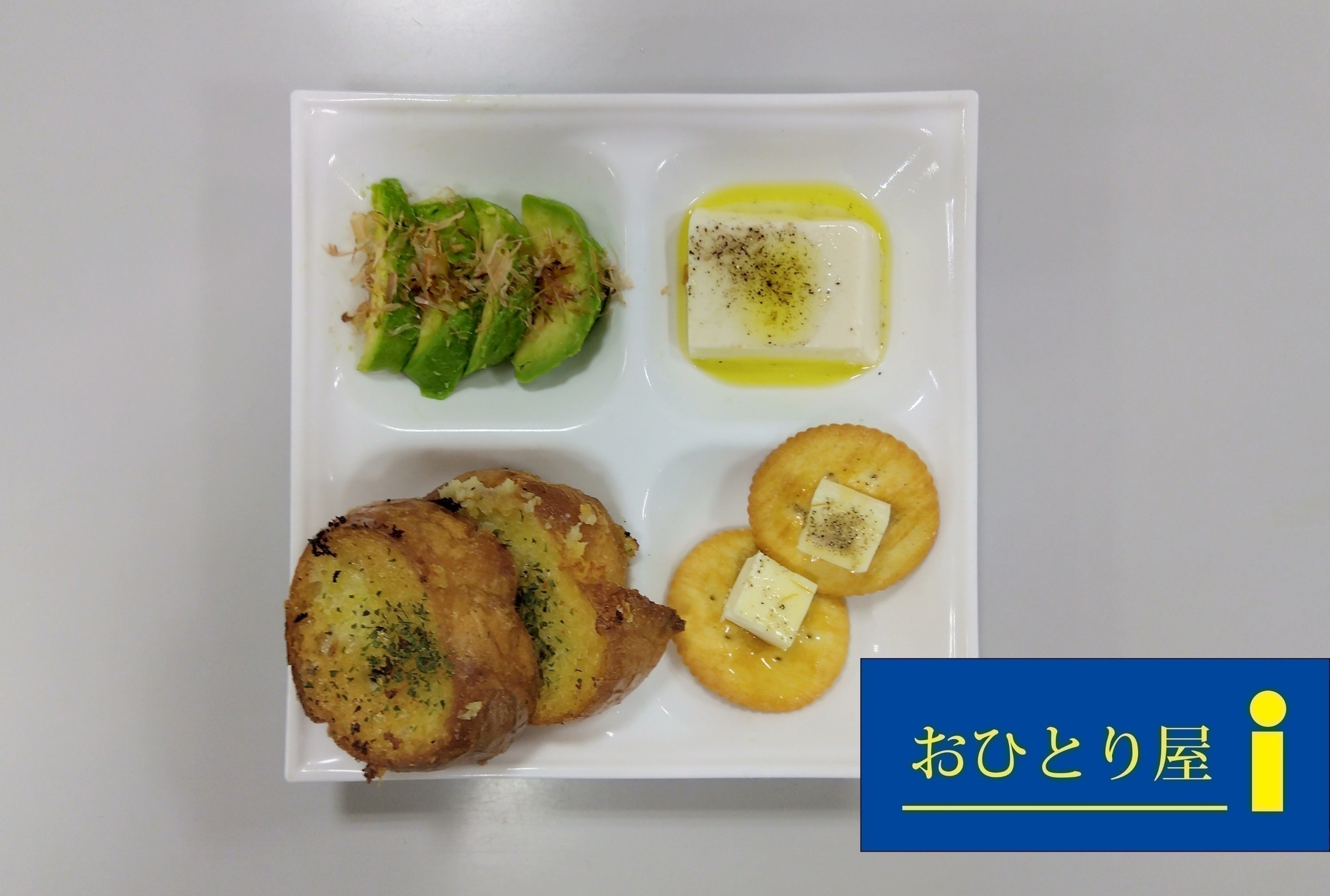 『アボカドのお刺身』『オリーブペッパー冷奴』『ガーリックトースト』『クリームチーズクラッカー』を1つのプレートでお楽しみになれるセットです。ガーリックトーストにアボカドのお刺身を乗せると、アボカドの柔らかさとトーストのカリカリ感が合わさった絶妙な食感になります。