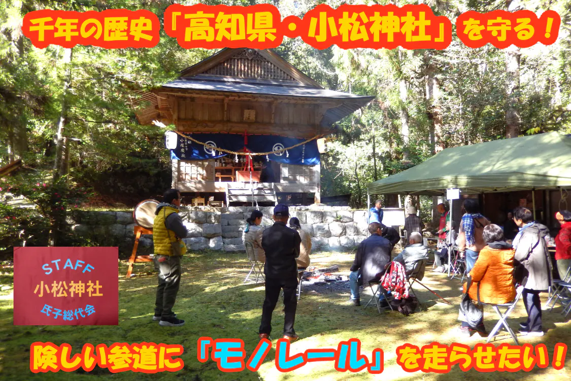 高知県の山岳地に鎮座して一千年余、「小松神社」を守り続けるために、神社参道に参拝者用の「モノレール」を設置して、高齢者や子供連れの若い人達も、安心して参拝が出来るようにしたいのです。