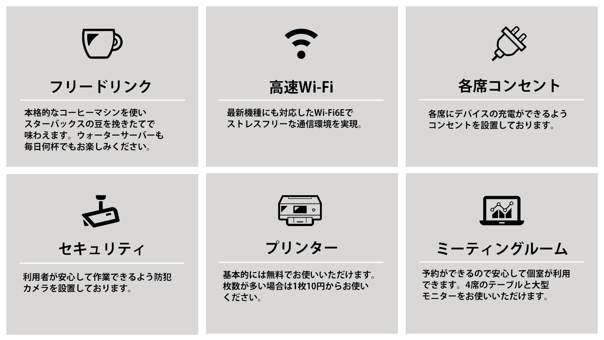 本コワーキングスペースは時間を気にせず朝から夜まで利用でき、大人モダンなカフェ空間で過ごす快適さと、用途に合わせたプライベート環境も確保致します。