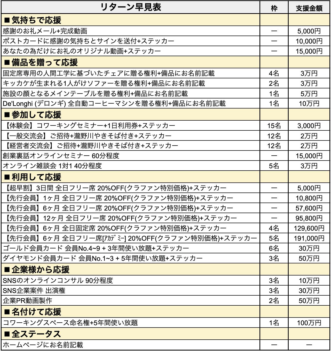 コワーキングスペースにとって大切な要素である机や椅子、照明等の購入に当てさせていただきます。