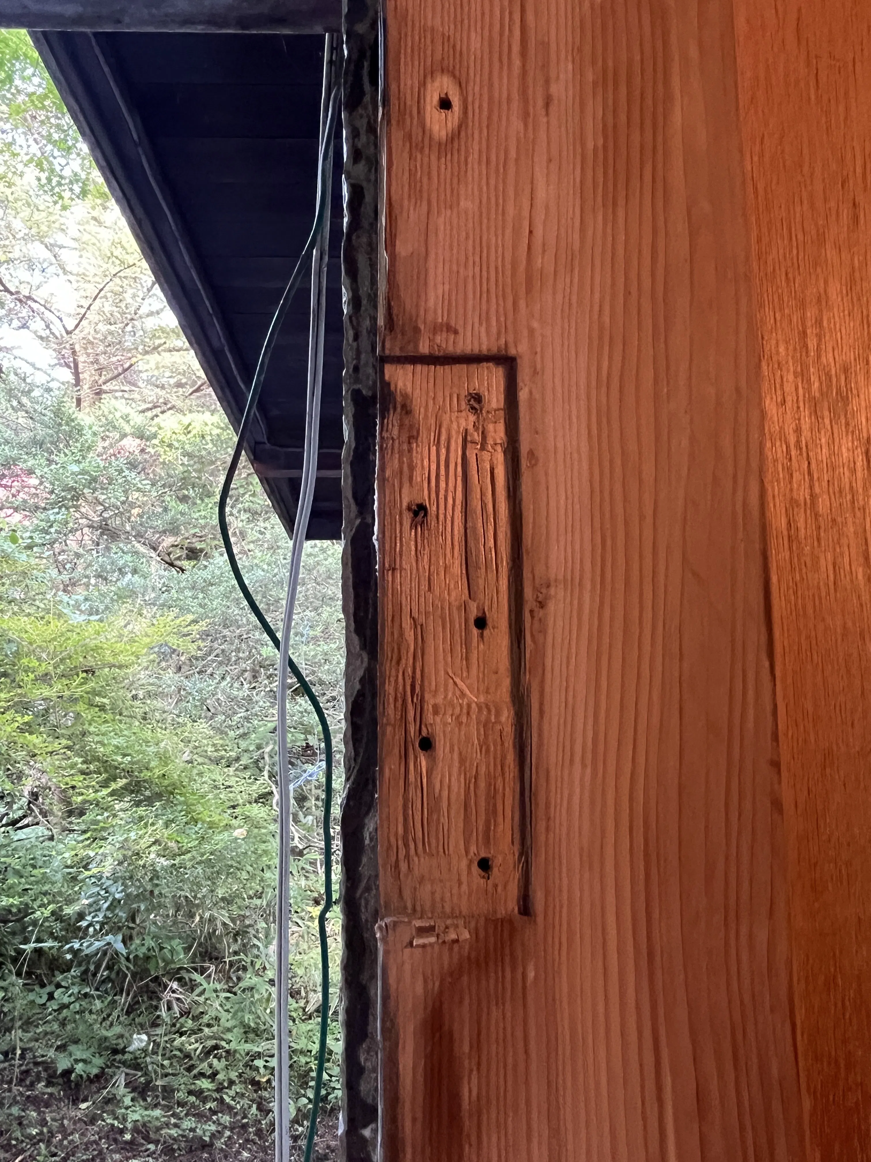 柱を掘り込んで直接蝶番をつけた跡があります。
