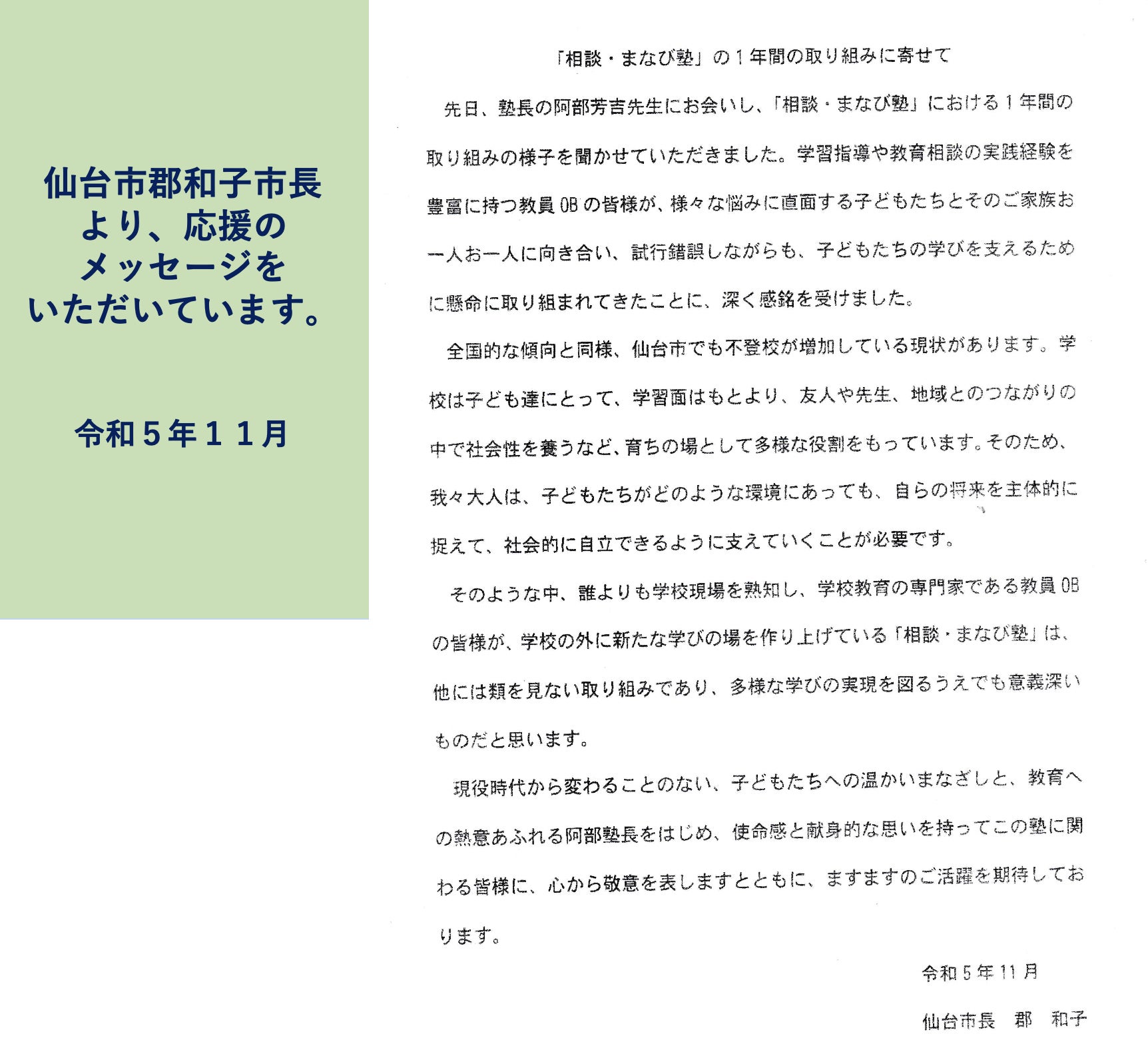私たちは、2022年9月に「相談・まなび塾」を開設し、一人一人の実態に応じた指導を行ってきました。その際、子どもだけでなく、ご家族の相談にも乗りながら個々の学習計画を立てて支援してきました。保護者と学校の橋渡しも行いながら、子どもたちの再登校を促して来ました。中心になって指導に当たったのは、元仙台市教育長や仙台市退職校長会の有志ですが、言わば教育のプロによる取組を実現しました。その結果、成績が格段に向上した子どもたちや、自信を取り戻した子どもたちも現れ、学校に戻っていったケースがいくつも生まれました。