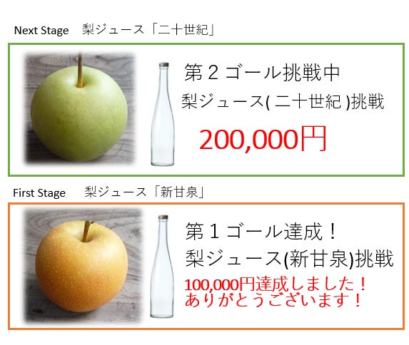 皆様からのお声をいただき、期間いっぱいまで、NEXT GOALとして二十世紀梨ジュース作成まで挑戦させていただければと思います。数には限りがございますが、引き続きどうぞよろしくお願いします!