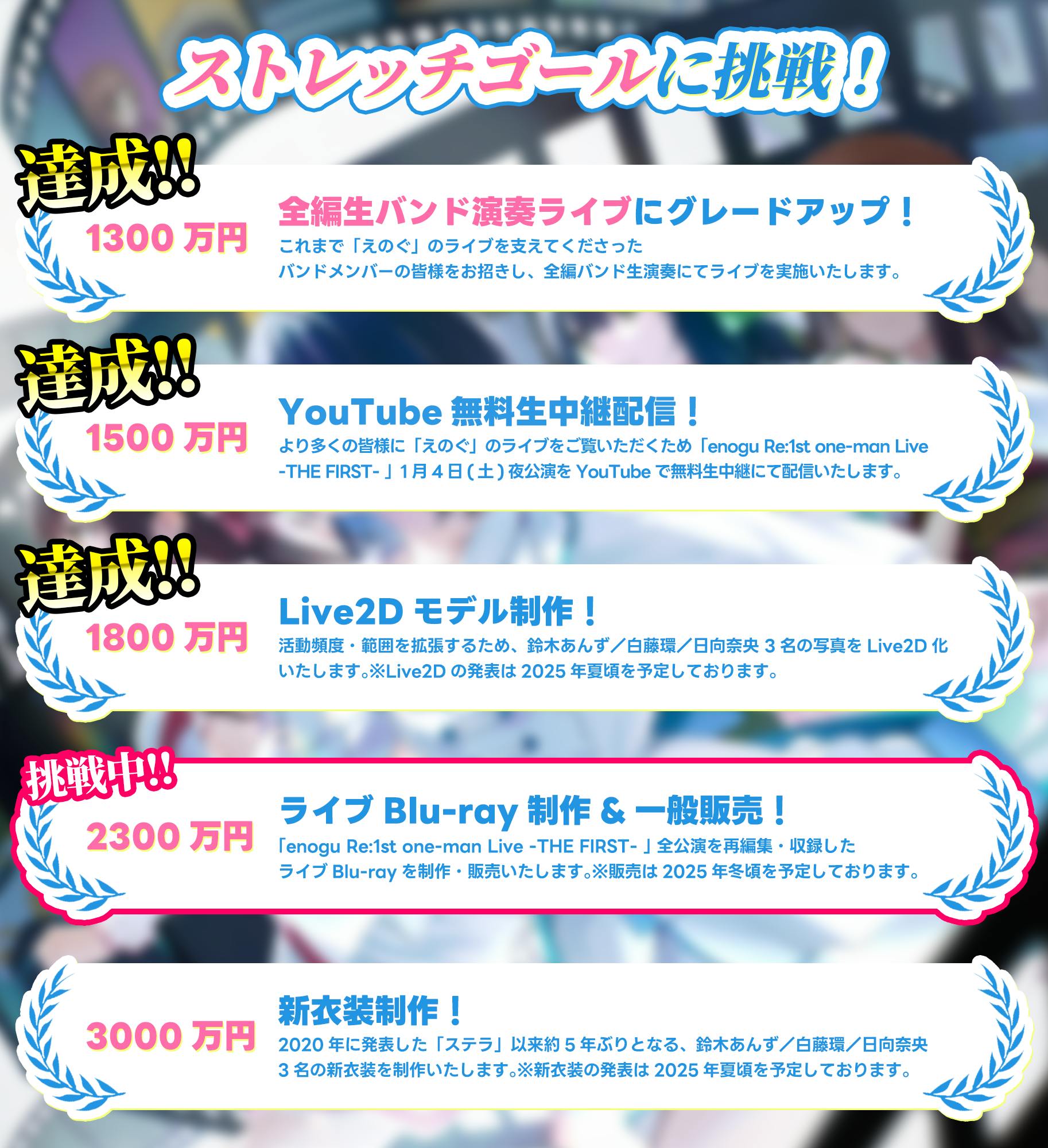 しかしながら前所属事務所の廃業に伴う独立を経験し経済状況が変化したことで、私たちの力だけでは「えのぐが目指す理想のライブ」実現に対するハードルが非常に高い状態です。このハードルを、皆様からのご支援を募るクラウドファンディグによって乗り越え、共にライブをつくりたいと考えております。