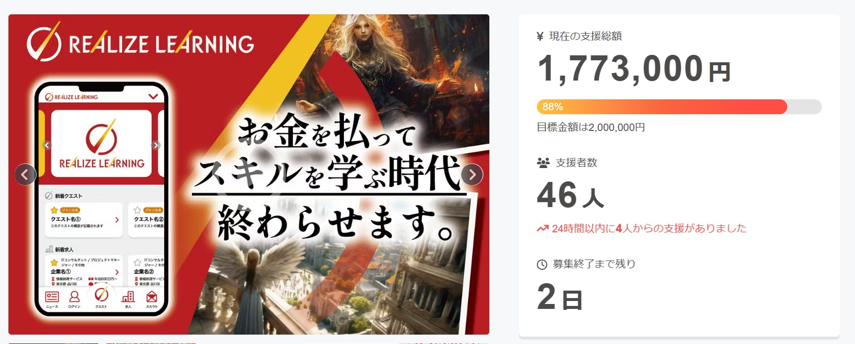 2024/11/27 09:47いつもご支援頂きありがとうございます!前回のご報告のちょうど半分、後23万円まで来ました。後2日、ラストスパートをかけておりますのでお力添え頂けたらとても嬉しいです!そしてようやく昨日「リアライズラーニング」をお披露目致しました!!!https://www.realizelearning.net/お手すきの際にもお試し頂けたら嬉しいです。引き続きどうぞよろしくお願いします! もっと見る