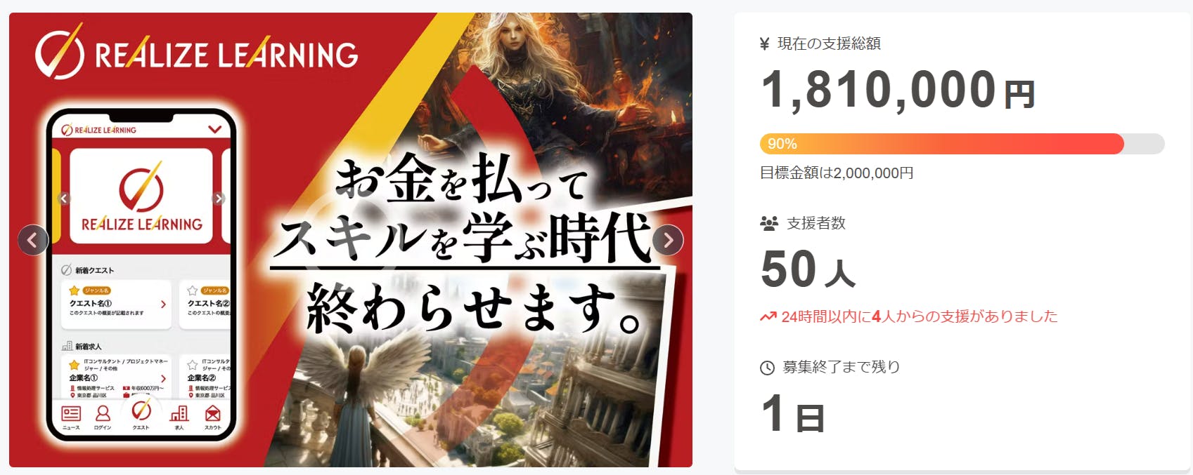 2024/11/28 13:20いつもご支援頂きありがとうございます!このクラウドファンディングを始めた時には、全く準備のイメージがついてなかったため後手後手の後手くらい回ってしまい、どうしたものかと思っていましたがようやくここまで来ました(笑)ラストスパートということもあり、このところお金のことばかりで大変恐縮ですが後、36時間なのでご容赦くださいませ。もしよろしければ最後の一押し、ご支援頂けたら嬉しいです!本サイトもオープンしております。https://www.realizelearning.net/何したいんだろ?と少しでも思われたら是非「リアライズラーニング」を試してみてください。どうぞよろしくお願いします!!! もっと見る