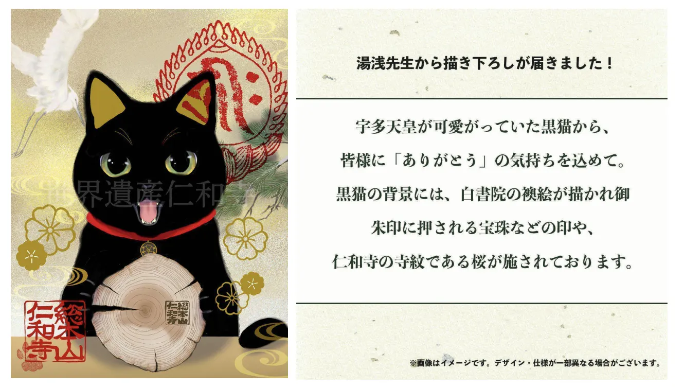 2024/11/21 16:55お待たせいたしました!先生から描き下ろしが届きました!「ありがとう!黒猫ステッカー」==宇多天皇が可愛がっていた黒猫から、 皆様に「ありがとう」の気持ちを込めて。 黒猫の背景には、白書院の襖絵が描かれ 御朱印に押される宝珠などの印や、 仁和寺の寺紋である桜が施されております。=====すでにご支援をいただいております皆様、どんなステッカーが届くかもわからない状況でもご支援を賜り誠にありがとうございます。「ありがとう」の気持ちが伝わりましたら幸いです。残り日数わずかとなって参りましたが、より多くの方々へ私たちのこの活動が届き、共感いただき応援いただけるよう頑張ってまいります。どうぞ引き続き応援よろしくお願いします。 もっと見る