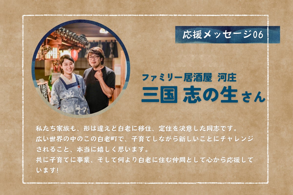 今日は、応援メッセージをいただいた『ファミリー居酒屋 河庄』の三国 志の生(しのぶ)さんをご紹介します。