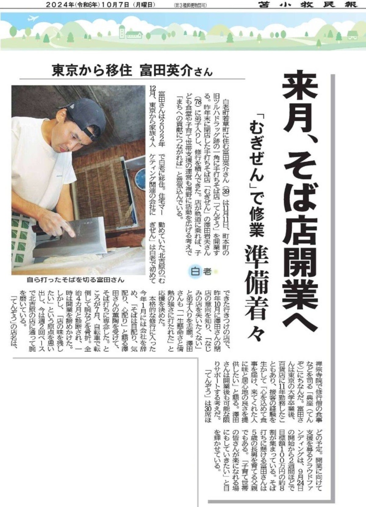 ▲来月、そば店開業へ 「むぎぜん」で修業 準備着々 東京から移住 富田英介さん 白老(2024.10.07/苫小牧民報)