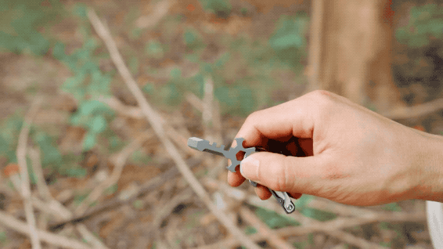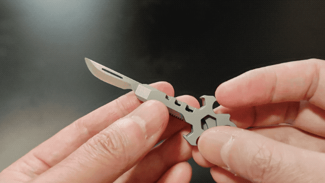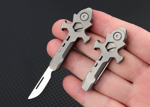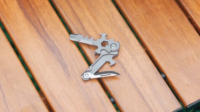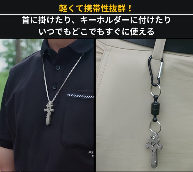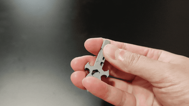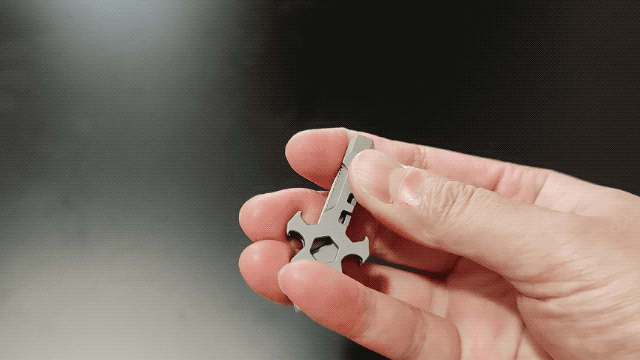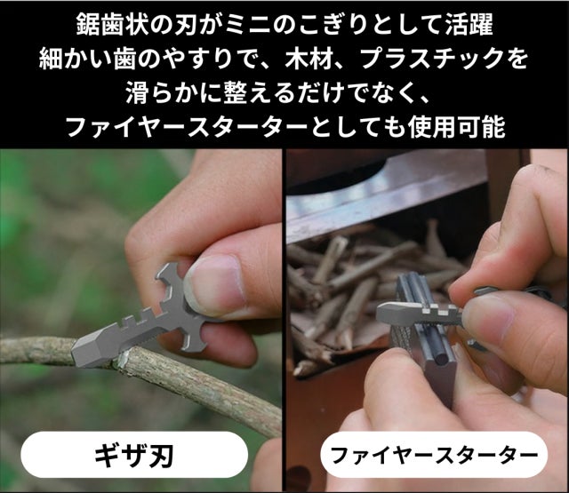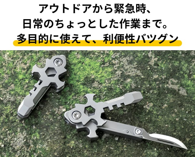 A:わずか17gのチタン製マルチツールです。チタンで作られたボディは、軽量さと頑丈さを併せ持ちます。段ボールの開封や紐の切断など、日常シーンはもちろん、キャンプやBBQといったアウトドアから災害時まで、幅広いシーンで活躍します。また、十字架をモチーフにしてできたデザインは、大人の遊び心もくすぐります。