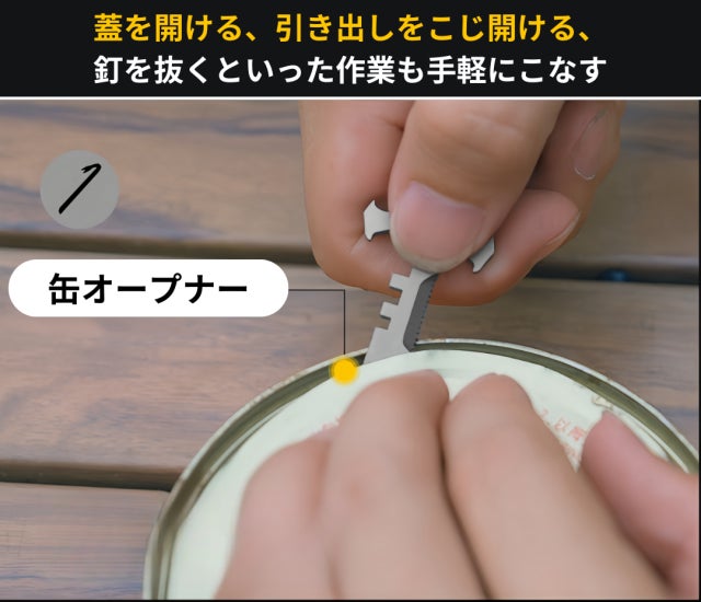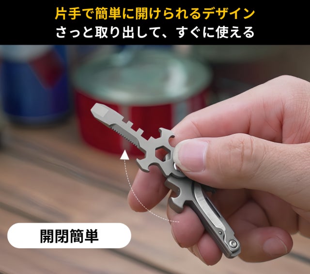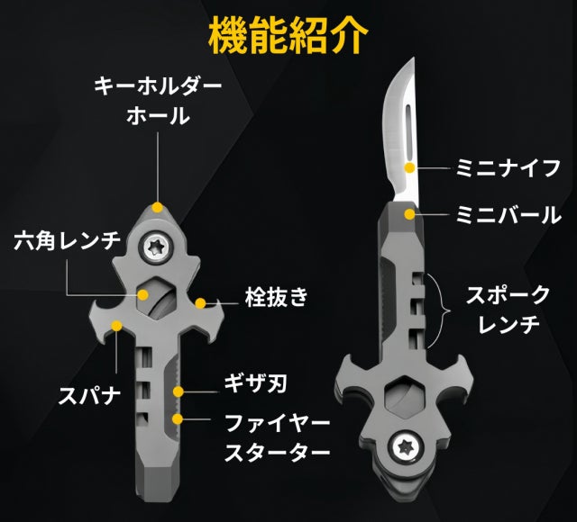ナイフ、レンチ、栓抜き、火起こし、バールなど、多彩な実用機能を備えており、アウトドアから日常生活まで、さまざまな場面で便利に活用できるツールです。
