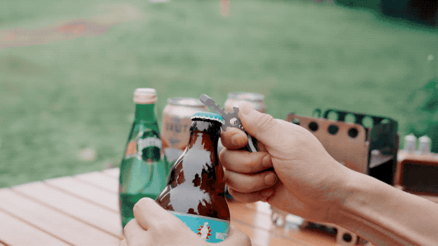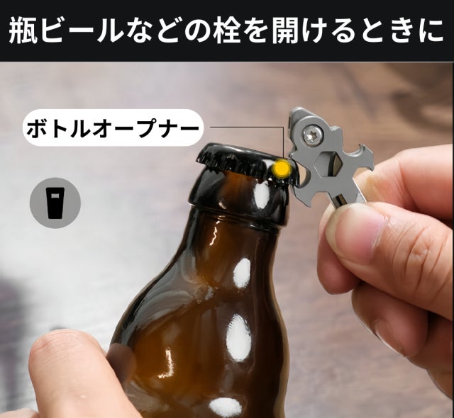 十字マルチツール「EMUC6」は栓抜き機能もついており、パーティーで瓶ビールを飲むとき、このツールがあれば、わざわざボトルオープナーを探す手間が省けます。