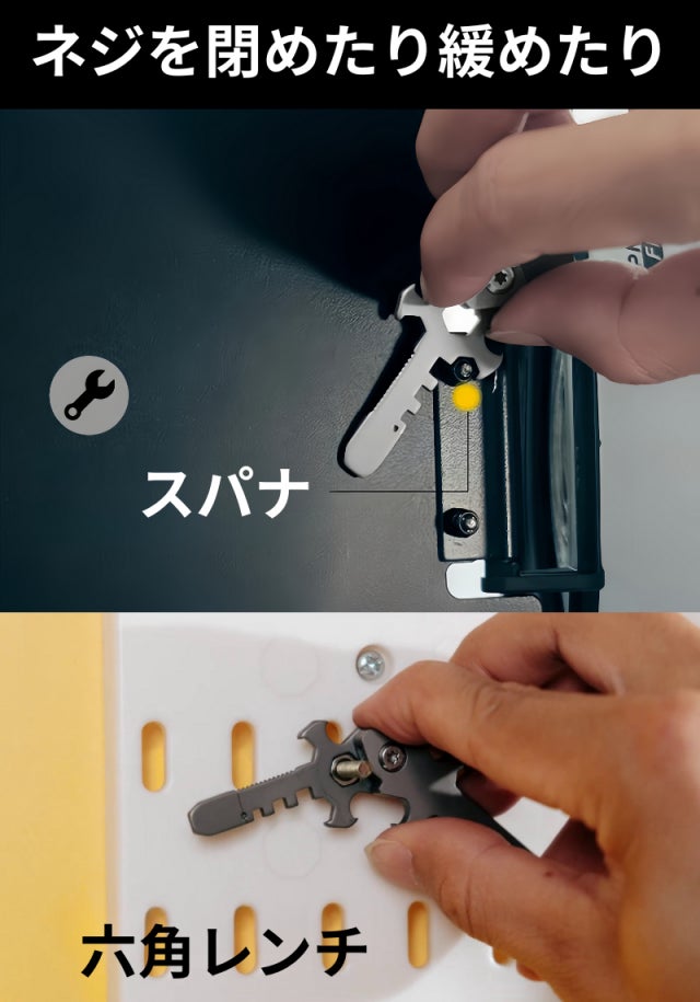 十字マルチツール「EMUC6」は六角レンチとスパナ機能も搭載され、